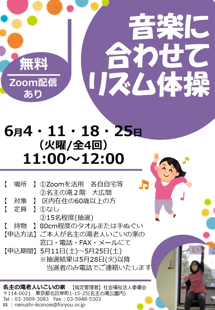 2024.05.11 お知らせ 6月もリズム体操♪ Tweet シェアする 6月も開催します!リズム体操♪ 申し込みお待ちしております(*^-^*) 名主の滝老人いこいの家 伊達 前の記事 2024.05.11 お知らせ レジンで作るお花のマグネット講座①② 次の記事 2024.05.10 お知らせ 5回目・脳いきいきタブレット講座開催しました♪ 一覧へ戻る