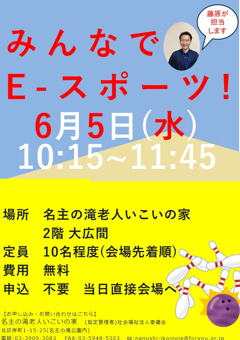 2024.05.19 お知らせ 6月5日(水)e-スポーツ開催致します!! Tweet シェアする 6月5日(水)10時15分~2階大広間にて「みんなでe-スポーツ」大会開催致します。 私、藤原が担当いたします。みんなで一緒に楽しみましょう!! 名主の滝老人いこいの家 藤原 前の記事 2024.05.19 お知らせ フラダンス教室開催しました 次の記事 2024.05.17 お知らせ 【作品展示中です】脳いきいきタブレット講座 一覧へ戻る