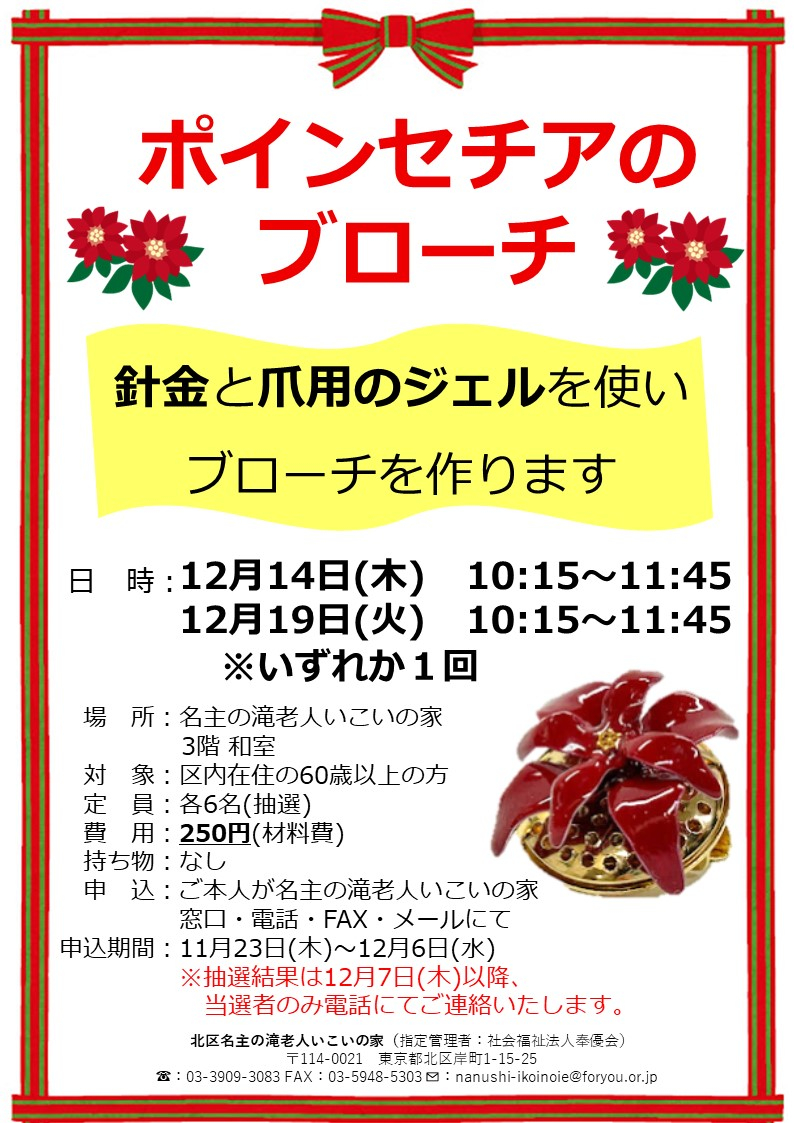 12月開催、ポインセチアのブローチづくりのお知らせです!