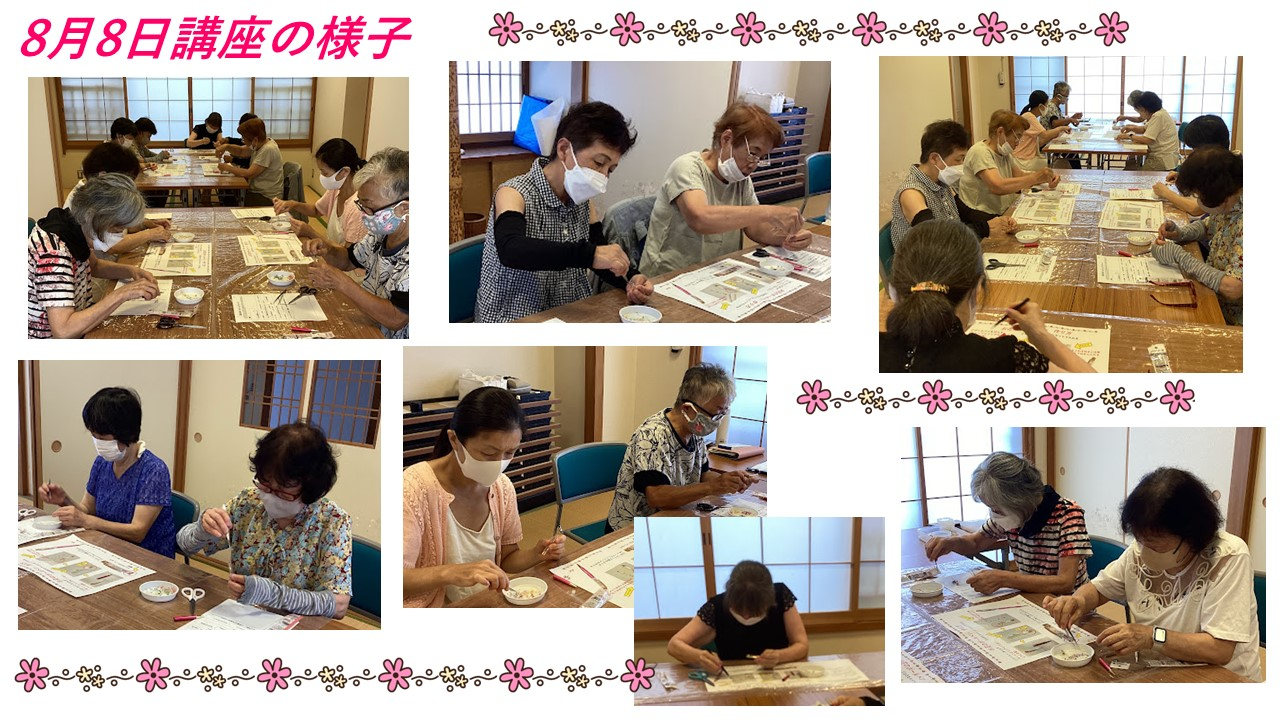 2024.08.09 活動報告 お花のボールペン講座の様子① Tweet シェアする お花のボールペン8月8日講座の様子です 世界に一つだけのボールペン完成です。 暑い中ご参加頂き、ありがとうございました。 名主の滝老人いこいの家の M 前の記事 2024.08.10 活動報告 みんなでボッチャ開催しました 次の記事 2024.08.09 活動報告 8月7日水曜日にきらりあ健康講座を開催しました 一覧へ戻る