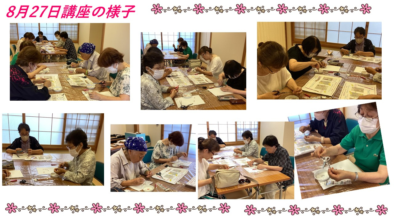 2024.08.28 活動報告 お花のボールペン講座の様子② Tweet シェアする 8月27日 お花のボールペン講座の様子です。 お花を入れる向きに注意しながら、皆さま素敵なボールペンが完成しました。 ご参加頂き、ありがとうございました。 名主の滝老人いこいの家 M 前の記事 2024.08.28 活動報告 きせかえドレス申込受付中 次の記事 2024.08.27 活動報告 『健康食品との安心・安全・上手なかかわり方』開催しました 一覧へ戻る