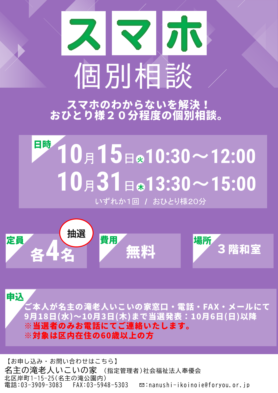 2024.09.18 お知らせ 10月の「スマホ個別相談」受付スタート Tweet シェアする 10月の「スマホ個別相談」の受付が始まっております。 くわしくはポスターをご覧くださいませ。 名主の滝老人いこいの家 S.K 前の記事 2024.09.20 お知らせ クレヨンアート【コスモス】① 次の記事 2024.09.15 お知らせ クジャペンと名主の滝をみました 一覧へ戻る