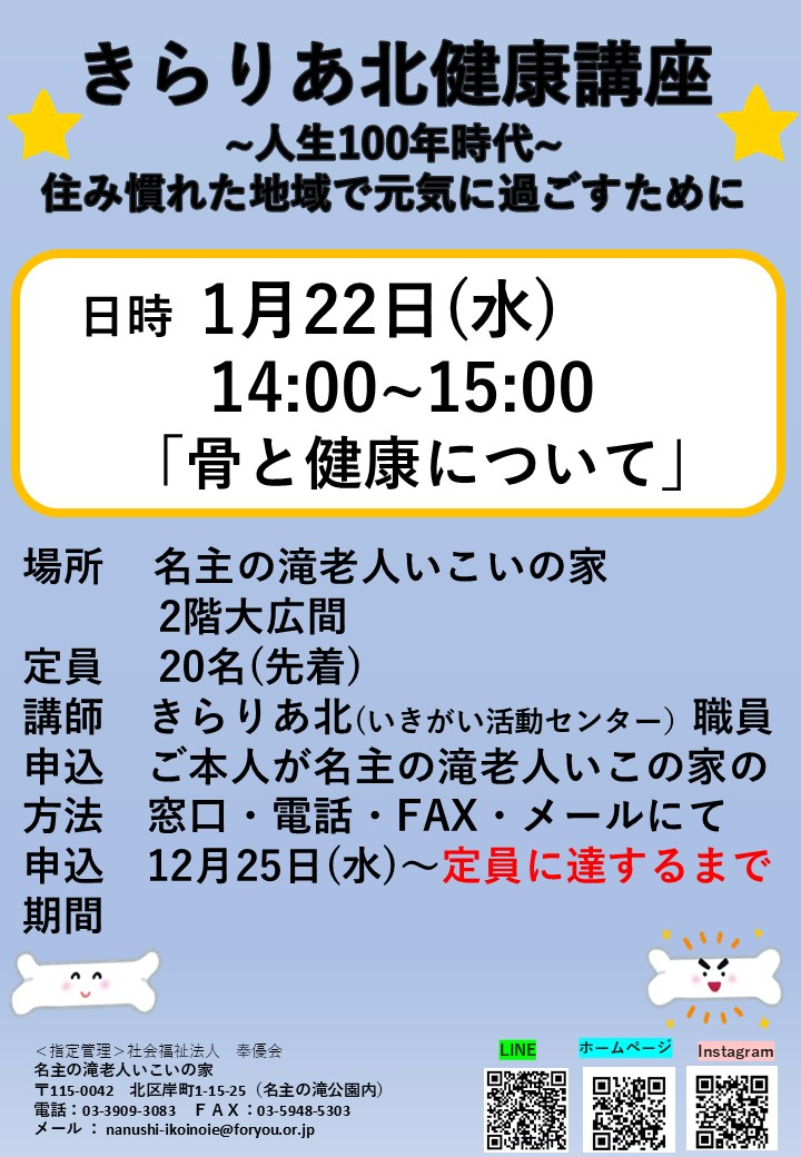 2024.12.25 お知らせ 【きらりあ健康講座】お申込み開始致します Tweet シェアする きらりあ健康講座お申込み開始致します。 20名先着順となっております。 沢山のお申込み心よりお待ちしております。 詳細は下記をご覧ください。 名主の滝老人いこいの家 藤原 前の記事 2024.12.25 お知らせ いこいこ通信1月号発行しました 次の記事 2024.12.25 お知らせ お正月の壁飾り講座の様子② 一覧へ戻る