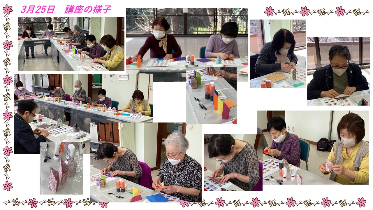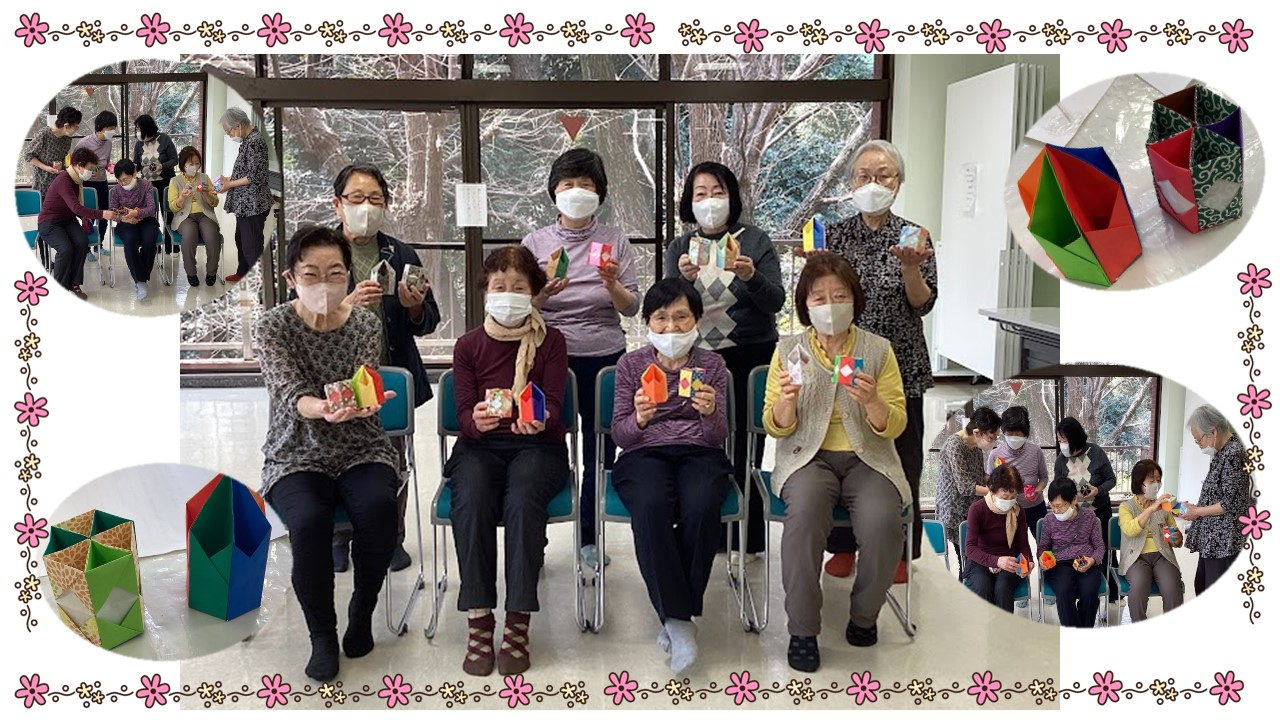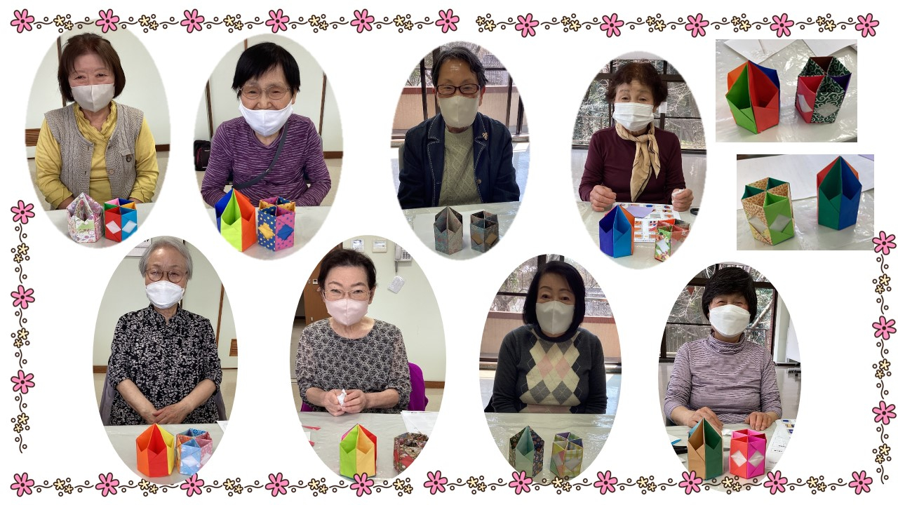 2025.03.27 活動報告 折り紙サロン講座の様子 Tweet シェアする 3月25日【折り紙サロン】折り紙で作る鉛筆立て講座の様子です。 和気あいあいとお話されたり作品を見せ合ったりと楽しい講座になりました。 ご参加頂きありがとうございました。 名主の滝老人いこいの家 M 前の記事 2025.03.30 活動報告 受付開始しました!!4月のスマホ交流会のテーマは「カメラ」です 次の記事 2025.03.27 活動報告 桜のリース講座の様子 一覧へ戻る