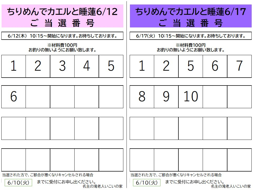 6月開催「ちりめんでカエルと睡蓮」講座の抽選結果を発表させていただきます。