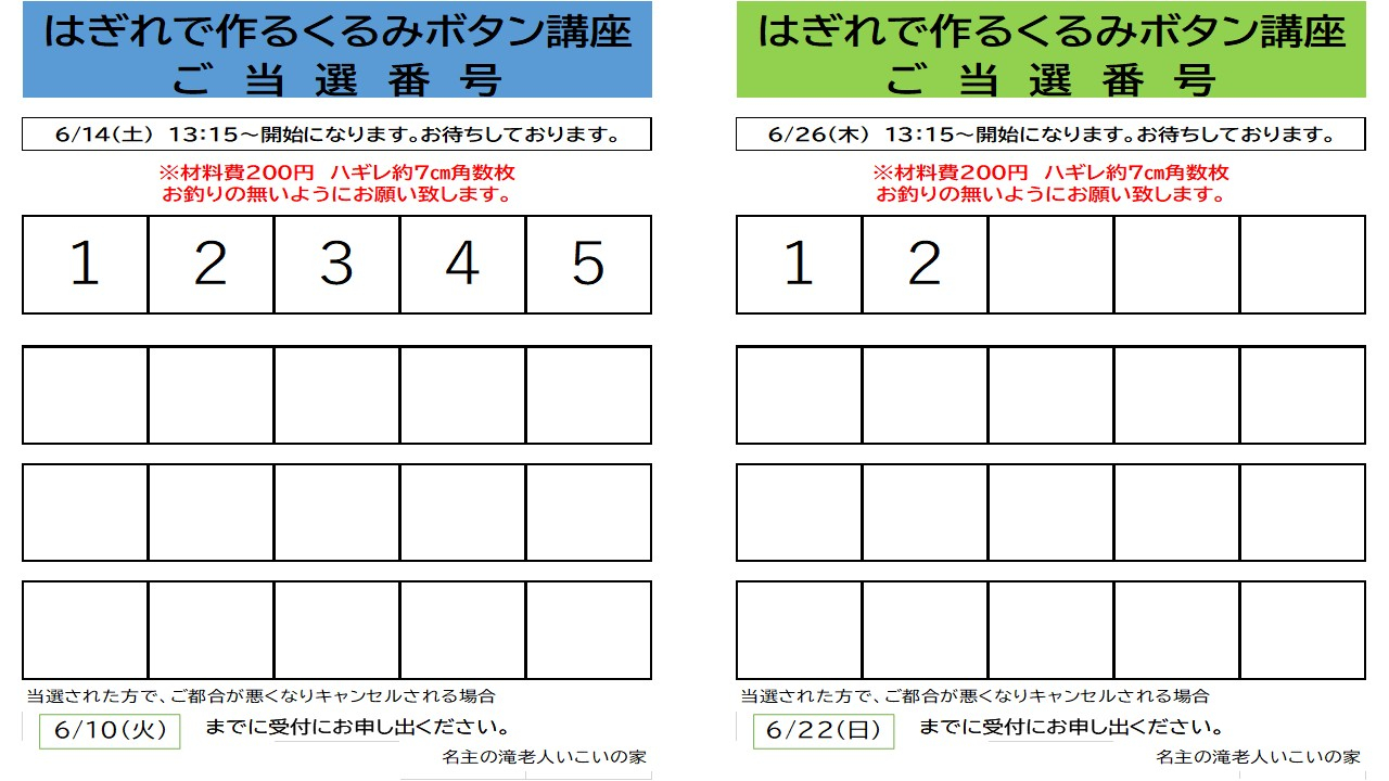 2025.06.06 お知らせ 【6月はぎれで作るくるみボタン】当選結果 Tweet シェアする 前の記事 2025.06.06 お知らせ 【追加募集中】ハギレでくるみボタンを作ろう 次の記事 2025.06.05 お知らせ 空手ビクス開催致しました 一覧へ戻る