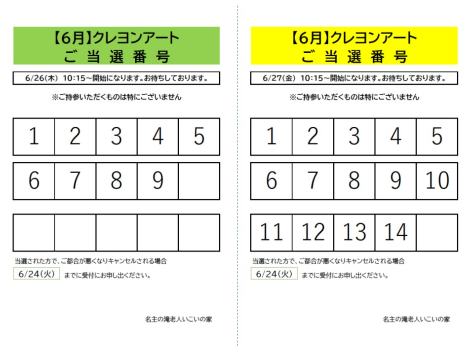 2025.06.19 お知らせ 【6月クレヨンアート】抽選結果のお知らせ Tweet シェアする 名主の滝老人いこいの家 F.M. 前の記事 2025.06.19 お知らせ 7月の「スマホ個別相談」募集開始しました 次の記事 2025.06.17 お知らせ ボランティアサイト YELLのご紹介 一覧へ戻る