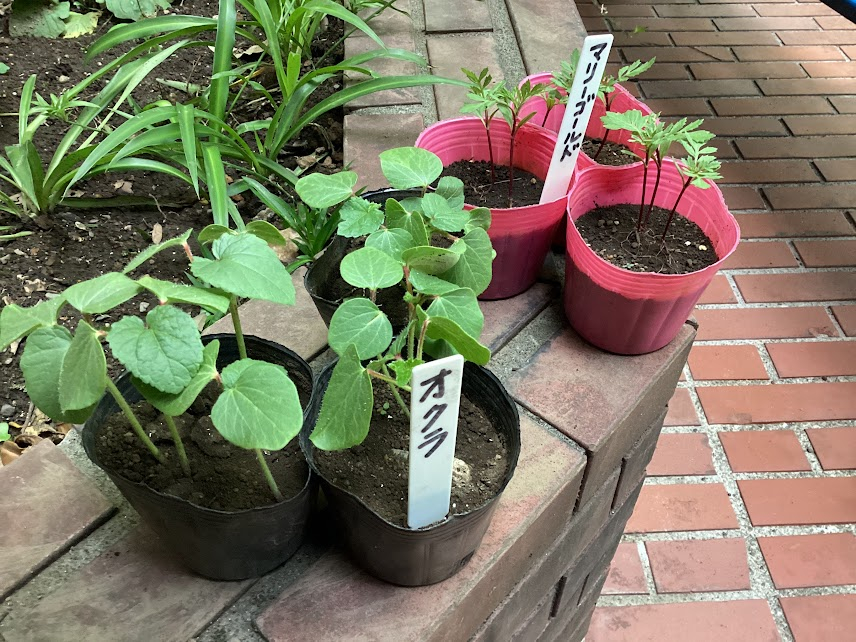 マリーゴールドのタネと、オクラのタネをポットで育てました。