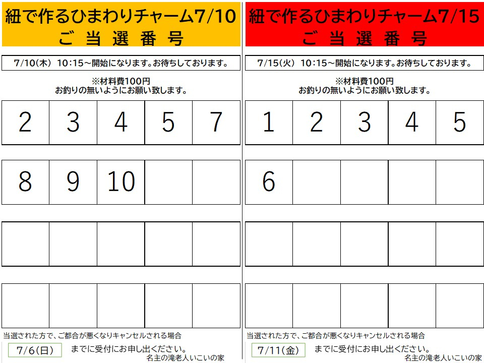 7月開催『紐で作るひまわりチャーム』講座の抽選結果を発表させていただきます。