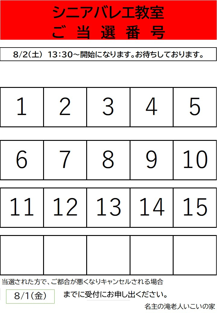 8月開催「シニアバレエ教室」抽選結果のお知らせ致します。