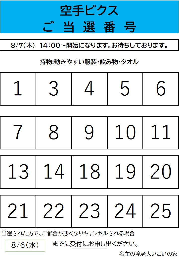 8-9月開催「空手ビクス」抽選結果のお知らせ致します。