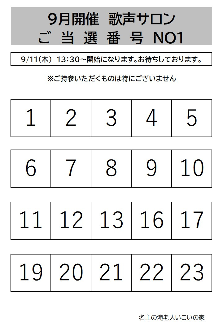 9月開催歌声サロンの抽選結果を発表させていただきます。