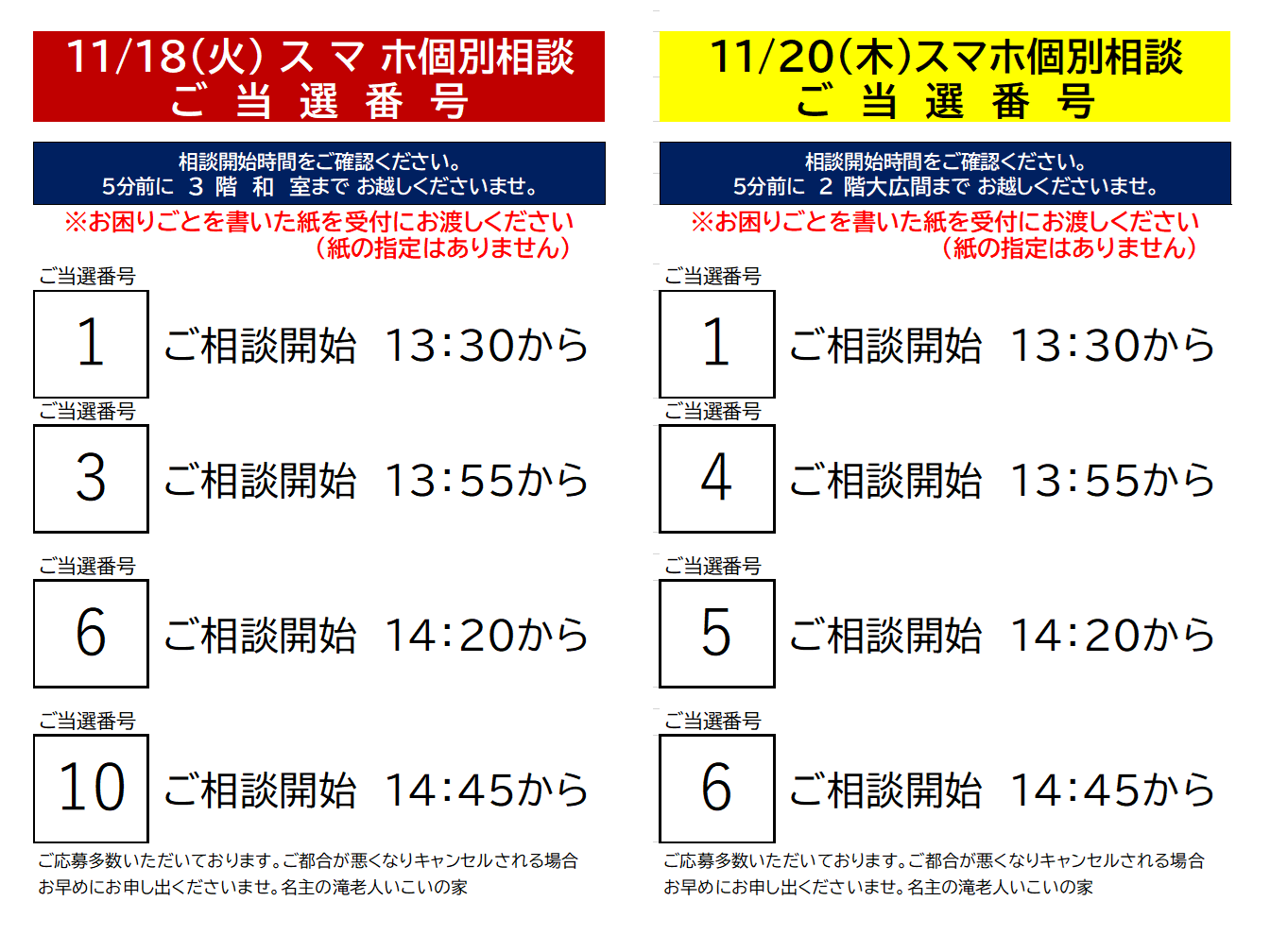 11月のスマホ個別相談の抽選結果を発表させていただきます。