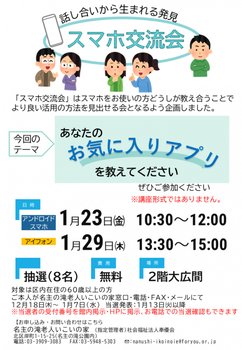2025.12.18 お知らせ 1月のスマホ個別相談の受付開始しました Tweet シェアする 1月のスマホ個別相談の受付開始しました。 くわしくはポスターをごらんくださいませ 名主の滝老人いこいの家 S 前の記事 2025.12.18 お知らせ フラダンス教室開催致しました 次の記事 2025.12.18 お知らせ 1月開催 スマホ交流会受付開始しました 一覧へ戻る