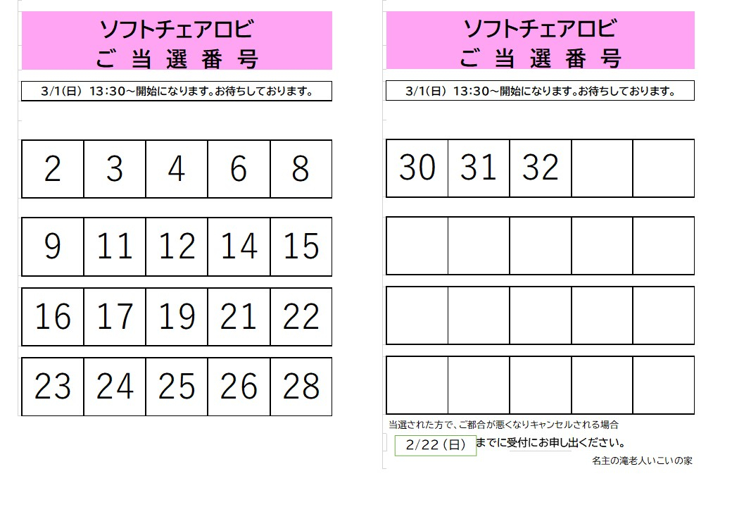 2026.02.15 お知らせ 【当選発表】「ソフトチェアロビ」抽選結果のお知らせ Tweet シェアする 3月開催「ソフトチェアロビ」の抽選結果を発表させていただきます。 お申込みされた方は、ご確認をお願いいたします。 ご参加お待ちしています。 前の記事 2026.02.15 お知らせ 桜のスワッグ講座の様子です 次の記事 2026.02.12 お知らせ 【当選発表】「可愛いポニー」抽選結果のお知らせ 一覧へ戻る