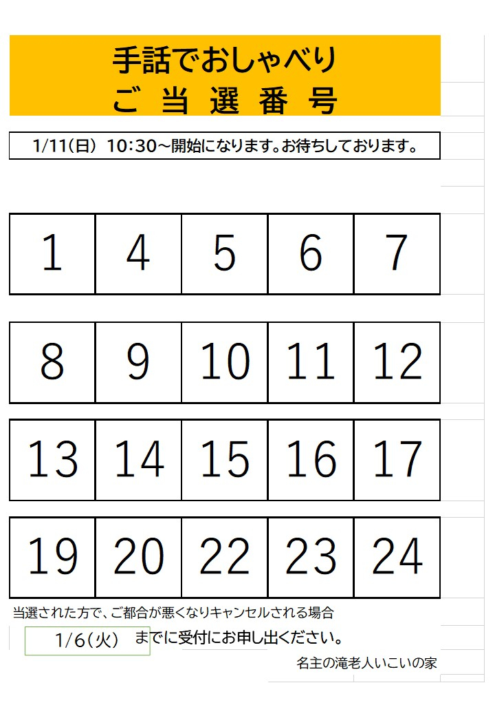 2025.12.28 お知らせ 【当選発表】「手話でおしゃべり」抽選結果のお知らせ Tweet シェアする 1月から3月開催「手話でおしゃべり」の抽選結果を発表させていただきます。 お申込みされた方は、ご確認をお願い致します。 ご参加お待ちしています。 名主の滝老人いこいの家 A.K 前の記事 2025.12.28 お知らせ 小物講座、皆様の作品の締めくくり 次の記事 2025.12.27 お知らせ 【当選発表】「1月開催歌声サロン」抽選結果のお知らせ 一覧へ戻る