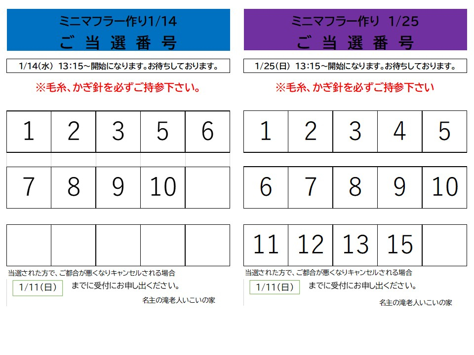 2026.01.09 お知らせ 【当選発表】「ミニマフラー作り」抽選発表結果のお知らせ Tweet シェアする 1月開ミニマフラー作り」の抽選結果を発表致します。 お申込みされた方は、ご確認をお願い致します。 持ち物:毛糸、かぎ針 ご参加お待ちしております。 名主の滝老人いこいの家 Y.M 前の記事 2026.01.09 お知らせ 空手ビクス申込み開始致します 次の記事 2026.01.08 お知らせ みんなでボッチャ開催致しました 一覧へ戻る