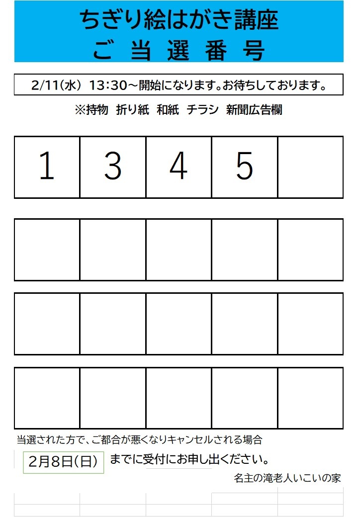 2月開催ちぎり絵はがき講座の抽選結果を発表させていただきます。