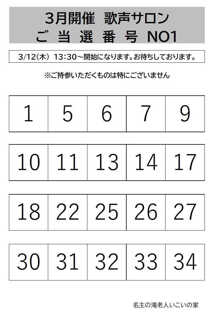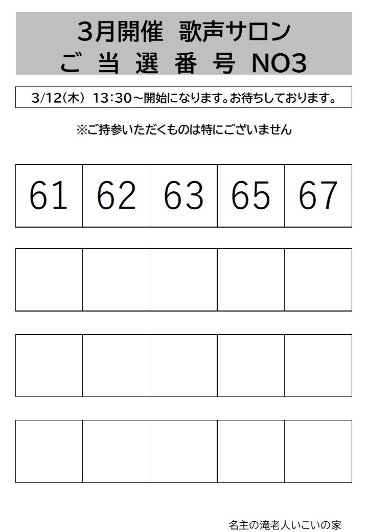 3月開催歌声サロンの抽選結果を発表させていただきます。