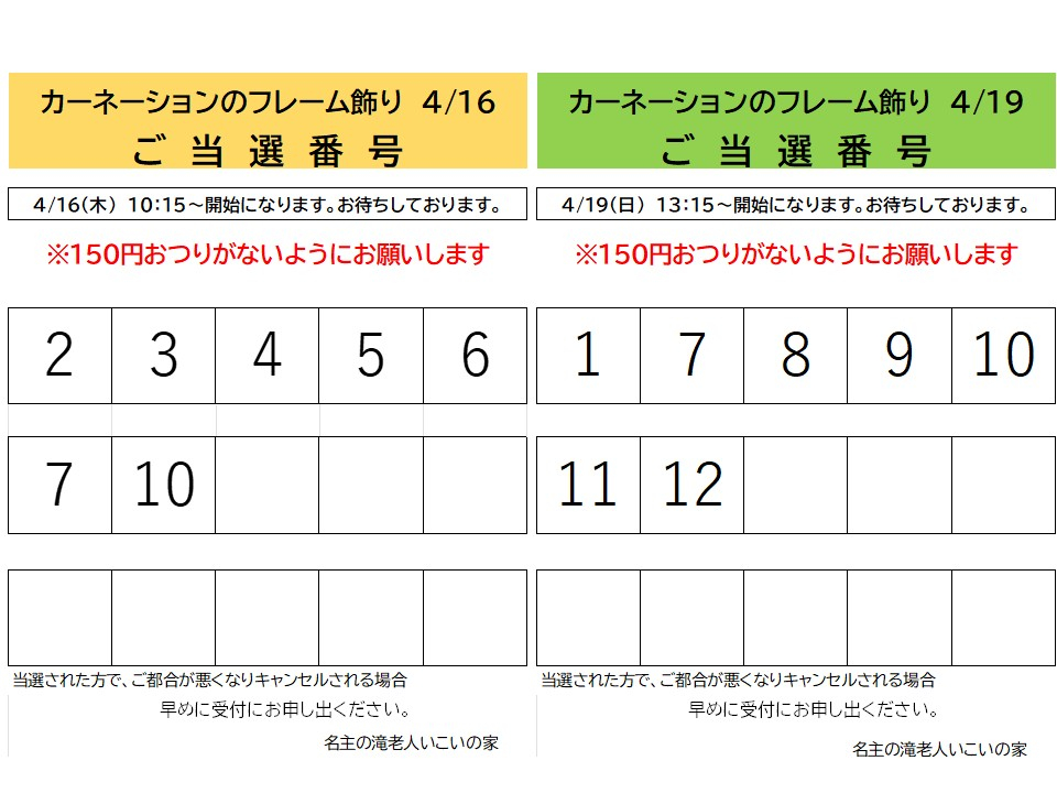 2026.04.09 お知らせ 【当選発表】「カーネーションのフレーム飾り」抽選結果のお知らせ Tweet シェアする 4月開催「カーネーションのフレーム飾り」の抽選結果を発表致します。 お申込みされた方は、ご確認をお願い致します。 名主の滝老人いこいの家 Y.M 前の記事 2026.04.09 お知らせ 初めてのかぎ針あみ開催しました 次の記事 2026.04.08 お知らせ 新卒職員さん実習中! 一覧へ戻る