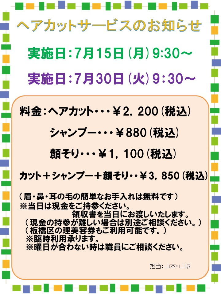 2024.07.01 お知らせ 【成増デイ】ヘアカットサービスのお知らせ Tweet シェアする おはよーございます。成増高齢者在宅サービスセンターです! いつも当ホームページをご覧いただきありがとうございます。 7月も2回あります。曜日が合わない方は臨時利用、もしくは職員に相談下さい。 前の記事 2024.07.01 お知らせ 【成増デイ】7月の献立表 次の記事 2024.07.01 お知らせ 【成増デイ】7月の工作のお知らせ 一覧へ戻る