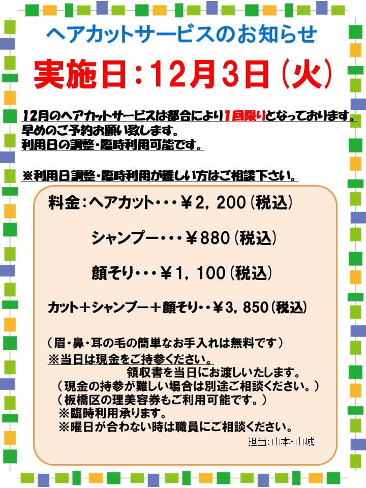 【成増デイ】12月のヘアカットサービスのお知らせ