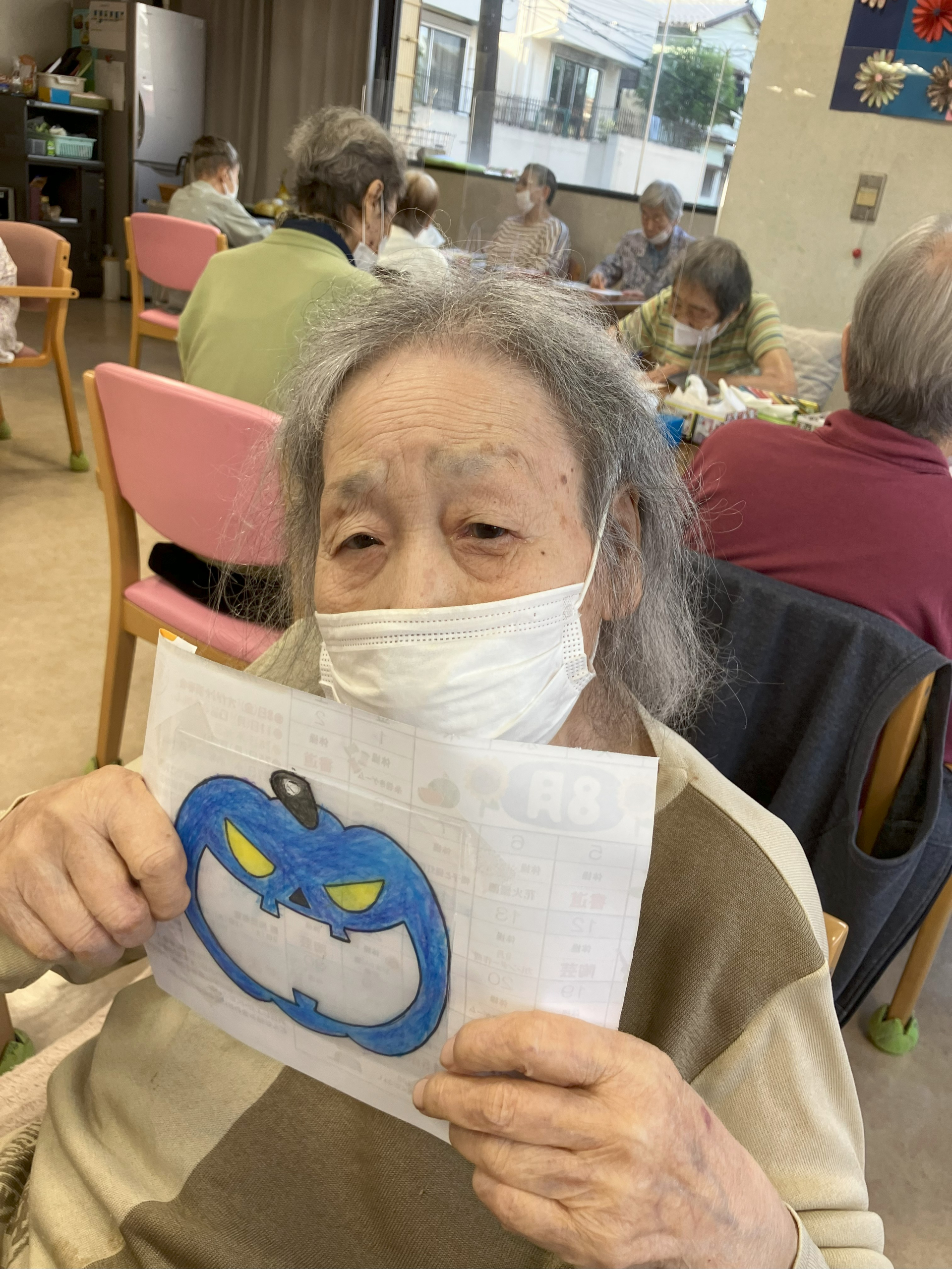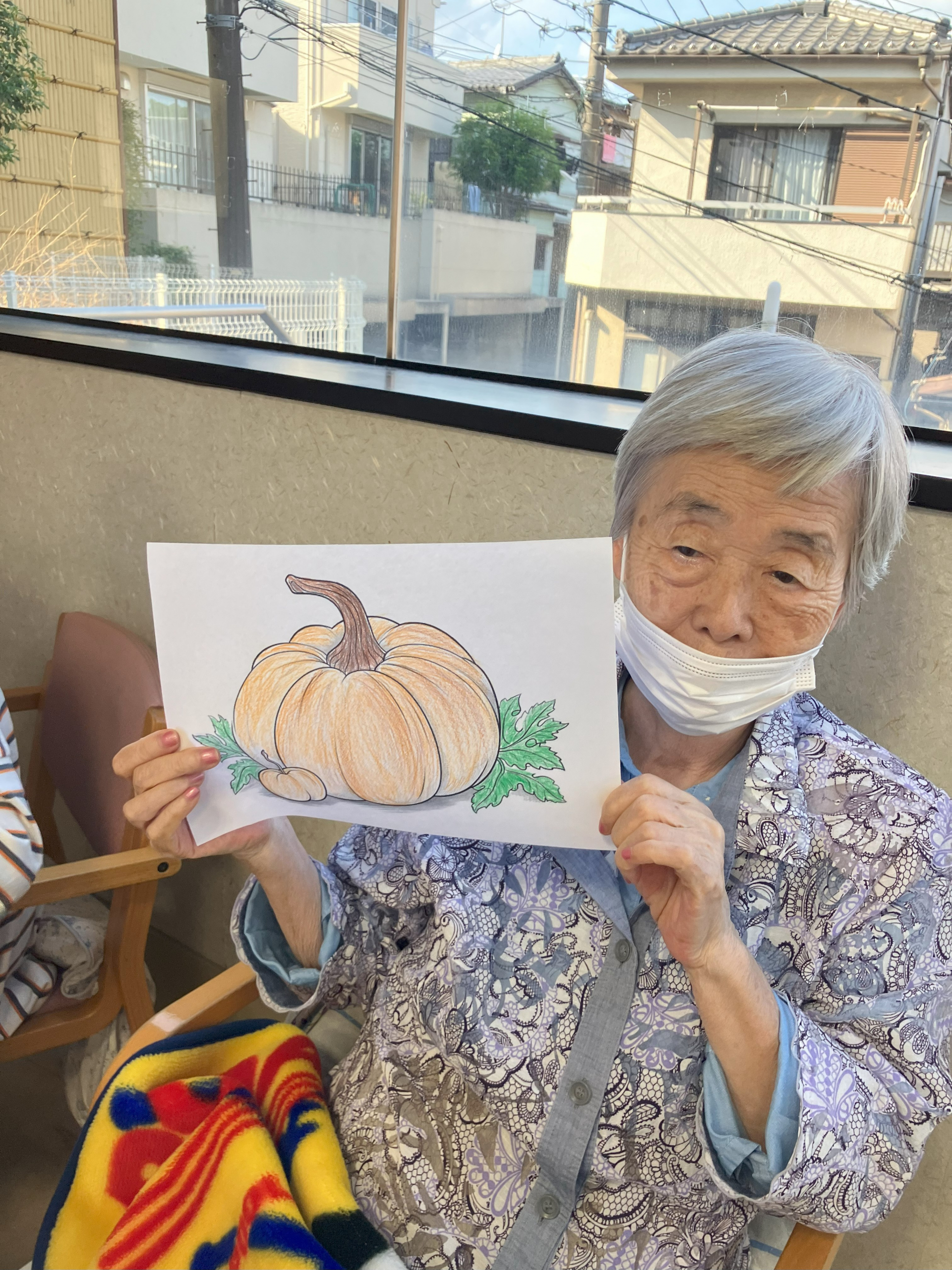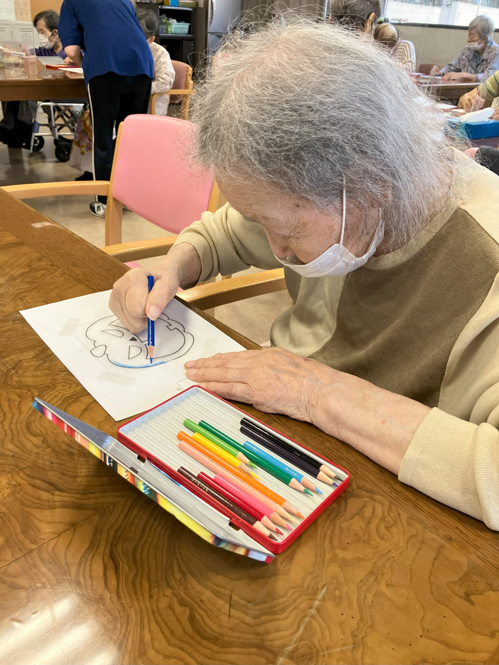 先日は制作でした、まずはカボチャのぬり絵をしました。