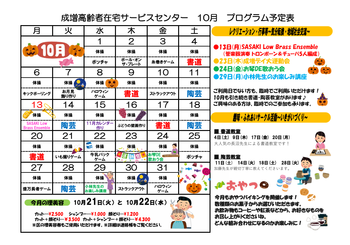 2025.09.29 お知らせ 【成増デイ】10月プログラム表 Tweet シェアする 10月のプログラム表ができました! 来月も楽しい催しをご用意してお待ちしております^^ 振替や臨時のご利用も受け付けております。 お気軽にお問い合わせください。 (担当:早津) 前の記事 2025.09.30 お知らせ 【成増デイ】10月献立表 次の記事 2025.09.29 お知らせ ☆成増デイ 塗り絵(ネームプレート作成)☆ 一覧へ戻る