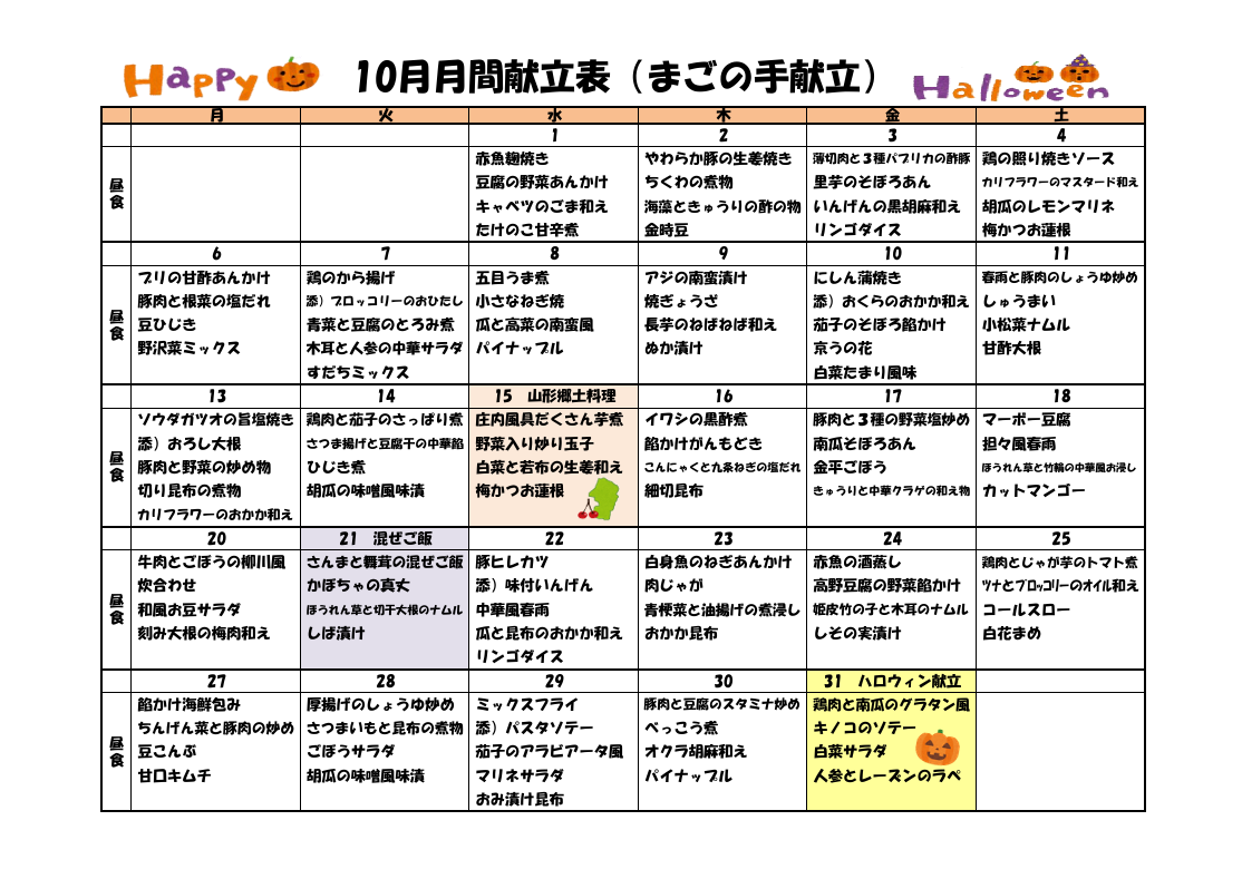 2025.09.30 お食事 【成増デイ】10月献立表 Tweet シェアする 10月の献立表です。 来月もバランスの取れたおいしいメニューをご用意してお待ちしております! (担当:早津) 前の記事 2025.10.01 お食事 ☆成増デイ さつまいも堀りゲーム☆ 次の記事 2025.09.29 お食事 【成増デイ】10月プログラム表 一覧へ戻る