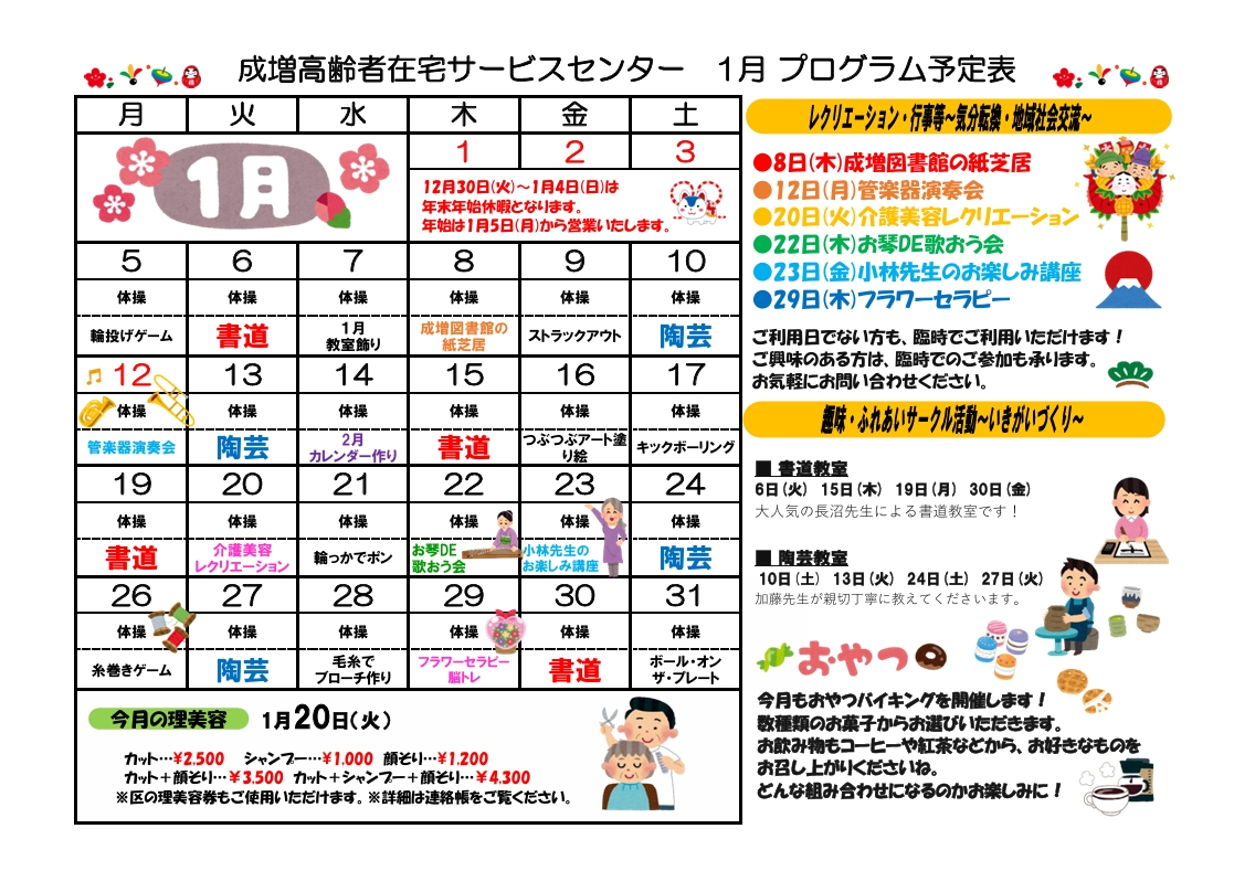 2025.12.26 お知らせ 【成増デイ】1月プログラム表 Tweet シェアする 1月のプログラム表ができました! 来年も楽しい催しをご用意してお待ちしております^^ 振替や臨時のご利用も受け付けております。 お気軽にお問い合わせください。 (担当:早津) 前の記事 2025.12.27 お知らせ 【成増デイ】1月献立表 次の記事 2025.12.19 お知らせ ☆成増デイ 1月カレンダー作成☆ 一覧へ戻る