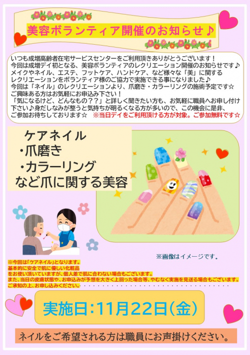 2024.11.28 【成増優っくりデイ】昼食イベント~お寿司~ 活動報告 2024.11.27 【成増優っくりデイサービス】『フォトフレーム作成』 活動報告(IN) 2024.11.26 成増優っくりデイサービス】『魚釣りゲーム』 活動報告 2024.11.25 【成増優っくりデイサービス】『窓越しの紅葉』作成 活動報告 2024.11.18 【成増優っくりデイ】満面の笑み 活動報告 2024.11.16 【成増優っくりデイ】介護美容研究所ボランティアのお知らせ~ 活動報告 2024.11.16 【成増優っくりデイ】サツマイモ芋ほりゲーム~焼き芋を食べたよ! 活動報告 2024.11.12 【成増優っくりデイ】ボッチャゲーム 活動報告 2024.11.11 【成増優っくりデイ】12月カレンダー作成 活動報告 2024.11.11 【成増優っくりデイ】HAPPY BIRTHDAY! 活動報告 2024.11.07 【成増優っくりデイ】書道 活動報告 2024.11.07 【成増優っくりデイ】もみじの壁画制作 活動報告 2024.11.04 【成増優っくりデイ】おたんじょ~び会! 活動報告 2024.11.01 【成増優っくりデイ】運動会おやつ 活動報告 2024.11.01 【成増優っくりデイ】ヘアカットサービスのお知らせ お知らせ 1 … 9 10 11 12 13 … 21