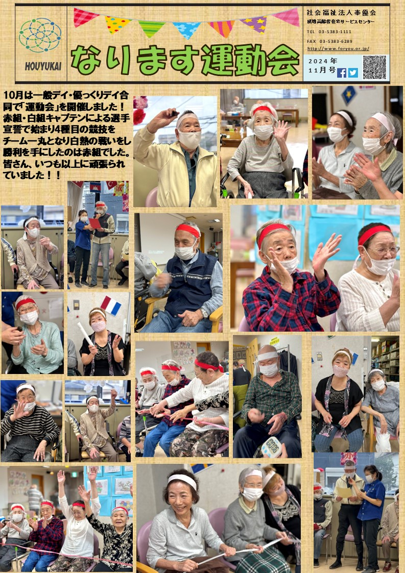 2024.12.02 活動報告 【成増優っくりデイ】なります運動会新聞 Tweet シェアする こんにちはー成増優っくりデイサービスです。 いつも当ホームページをご覧いただきありがとうございます! 今月も活動写真バンバン投稿しますのでお楽しみに~ 前の記事 2024.12.02 活動報告 【成増優っくりデイ】クリスマスイベントのお知らせ 次の記事 2024.12.02 活動報告 【成増優っくりデイ】介護美容研究所ボランティア~ケアネイル 一覧へ戻る