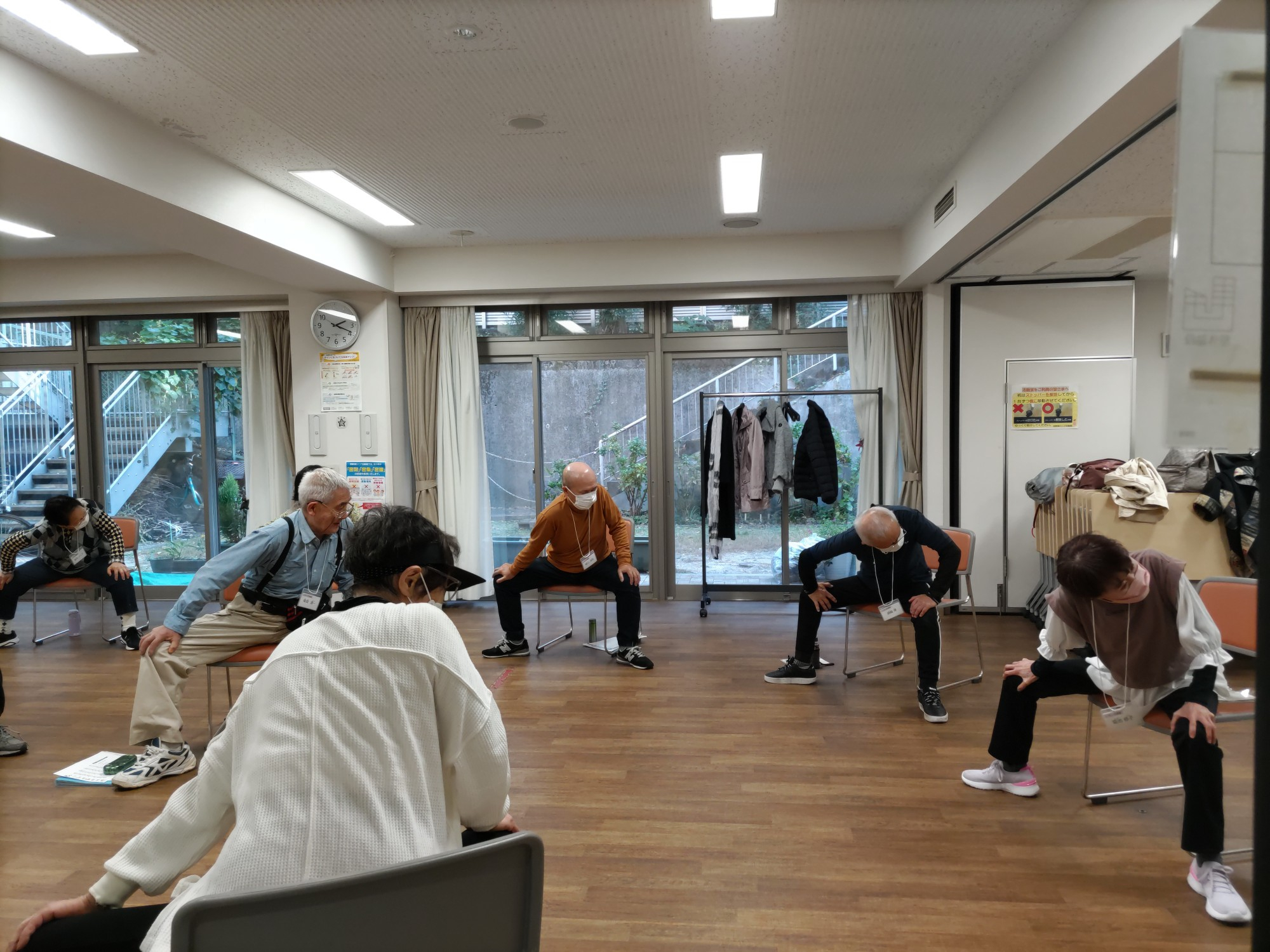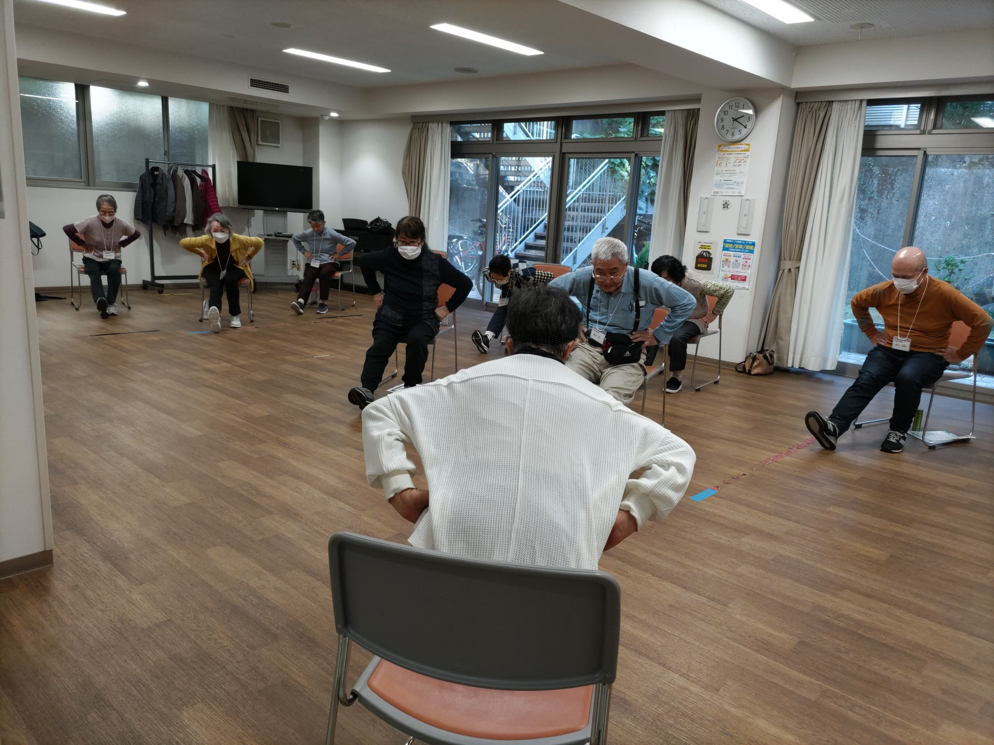 新宿いきいき体操のDVDを観ながらいきいきサポーター指導の下、20名くらいの利用者様と体操を行っています。