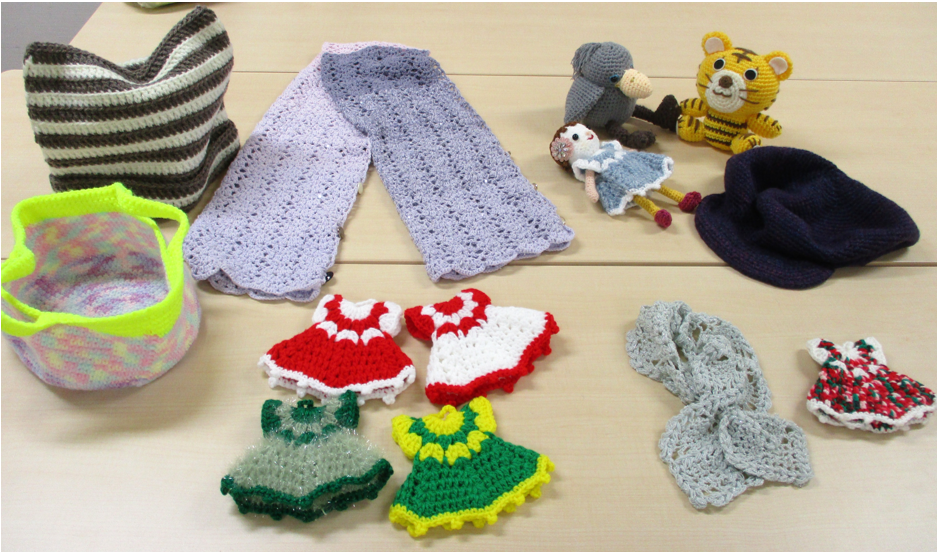 ドレス型アクリルたわし、ニット帽、ストール、あみぐるみなど