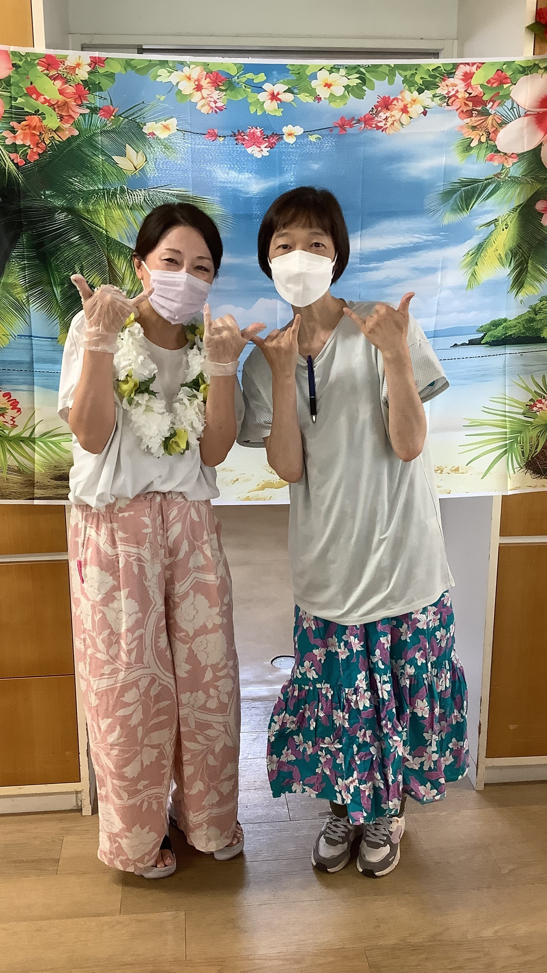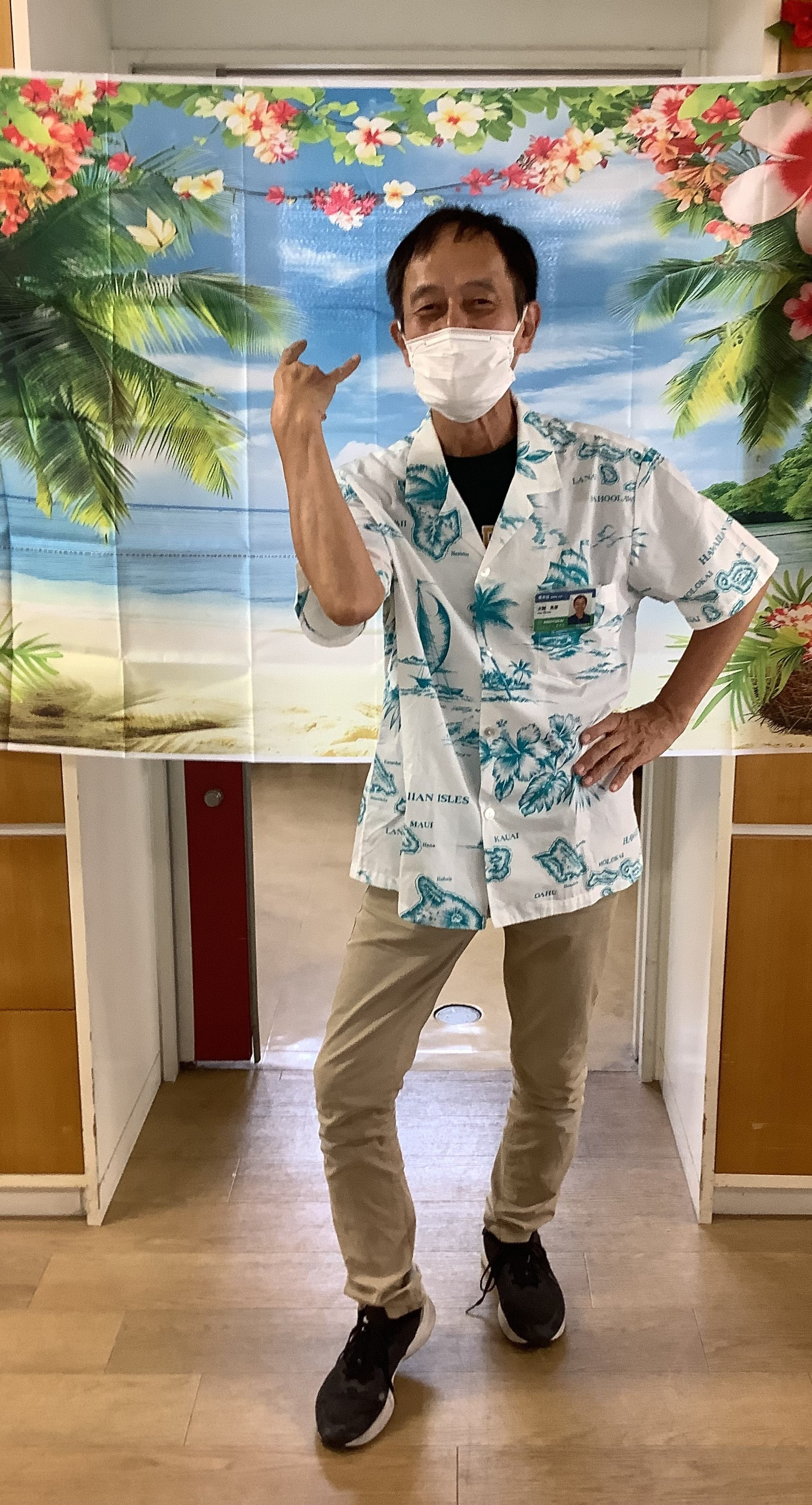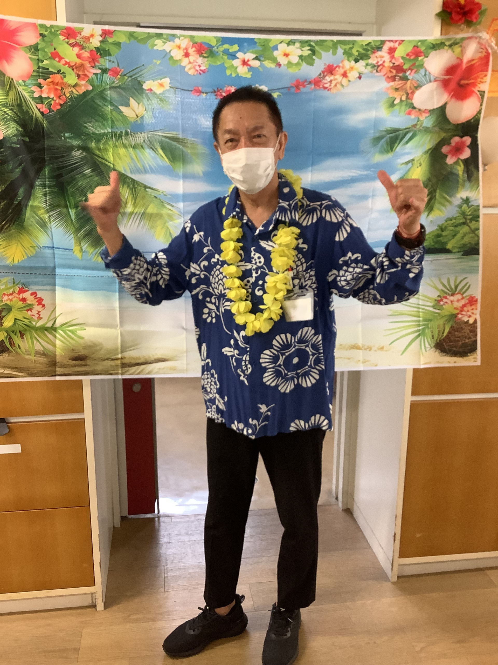 今日は午前中から職員は制服ではなく、ハワイ感満載の複勝で、フロアも一気にハワイアンムードになっていました!!