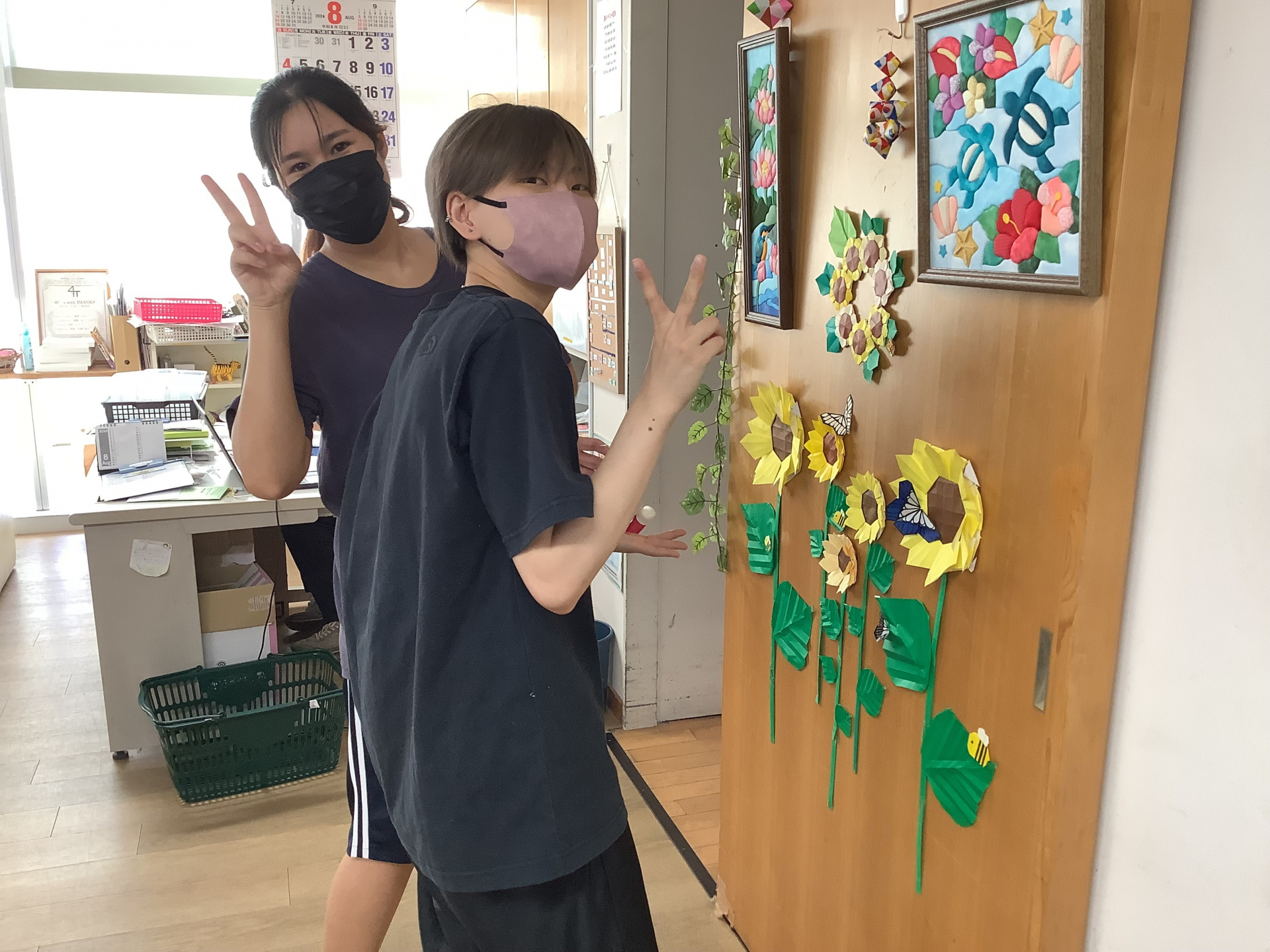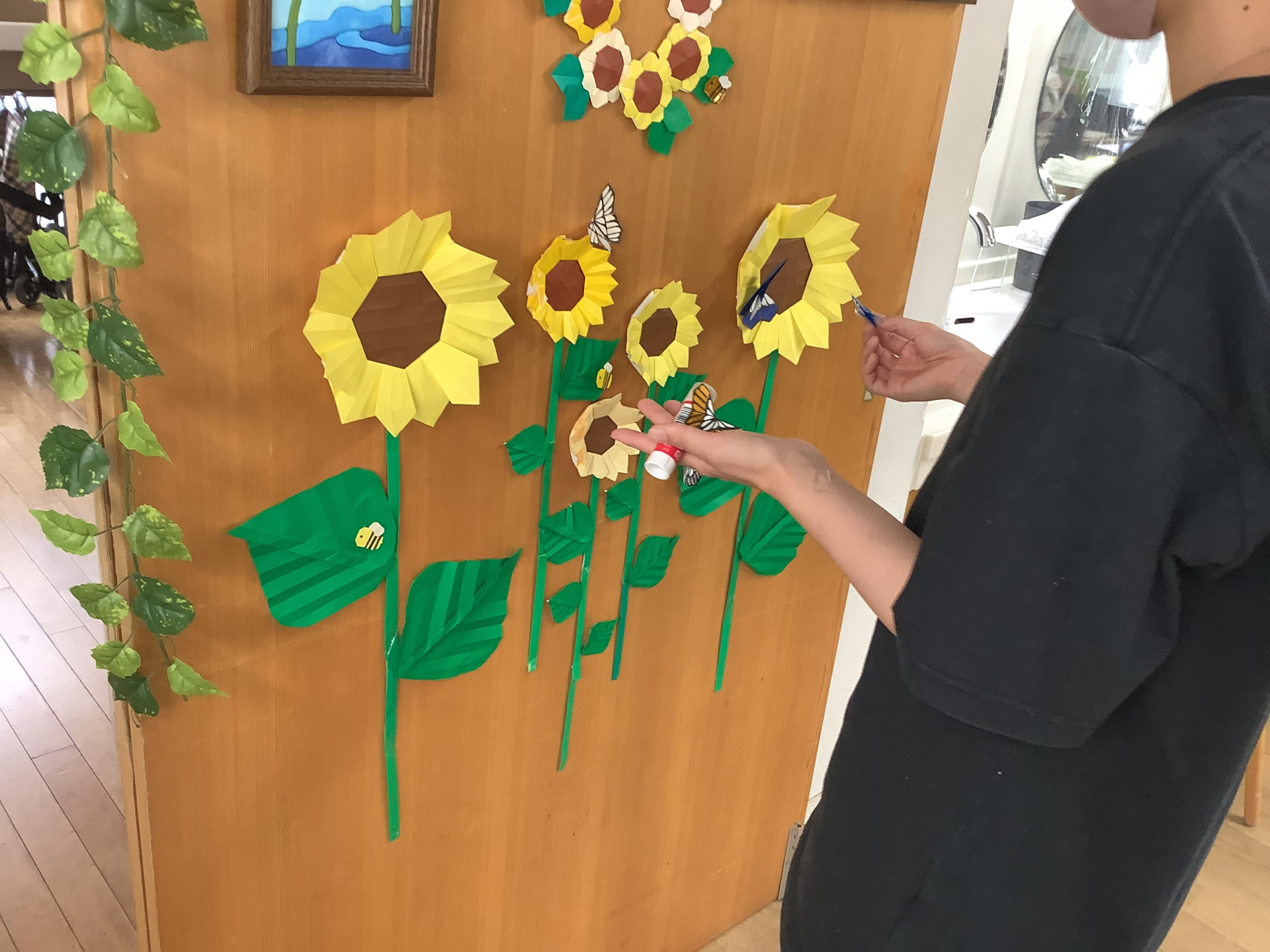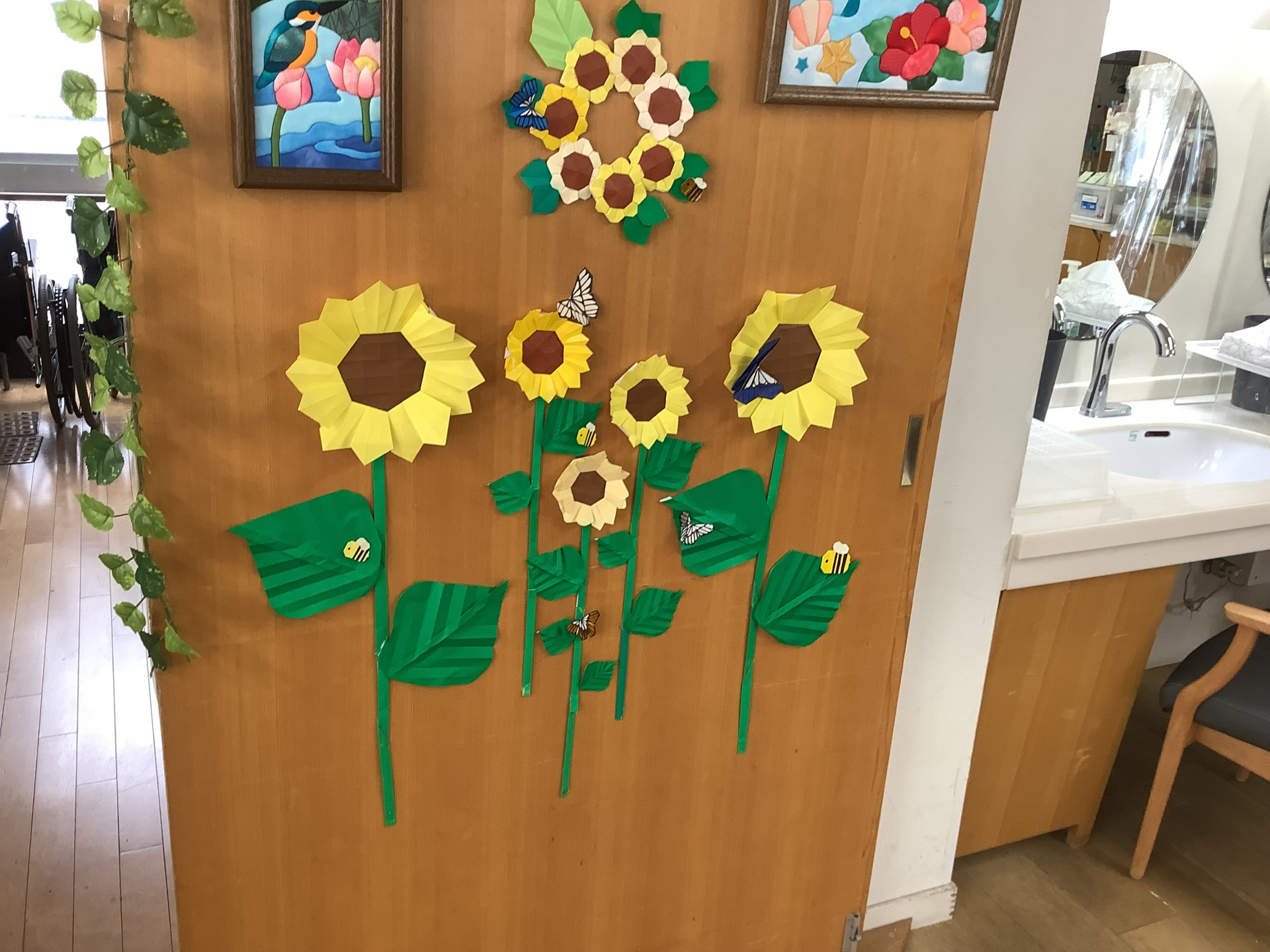 夏のお花といえばひまわり!!空いた時間にご利用者様と一緒に貼り飾り付けをしました。