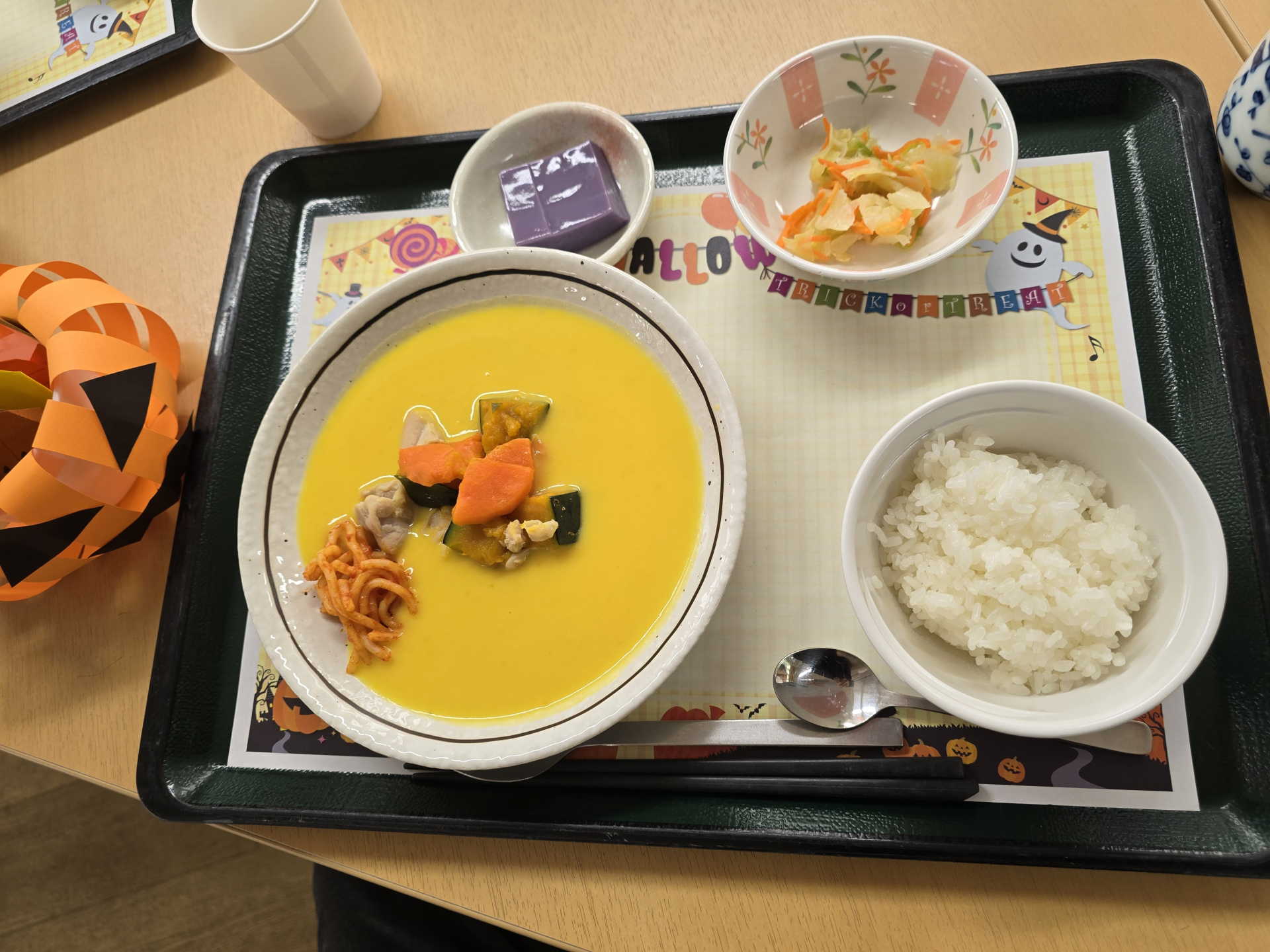 今日はハロウィン特別メニューということで、かぼちゃのスープです!!