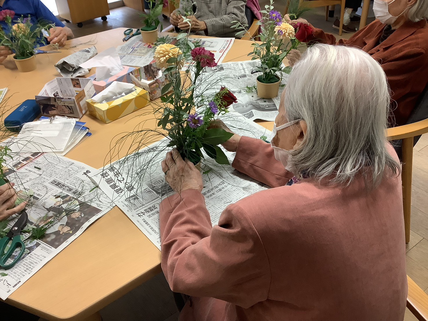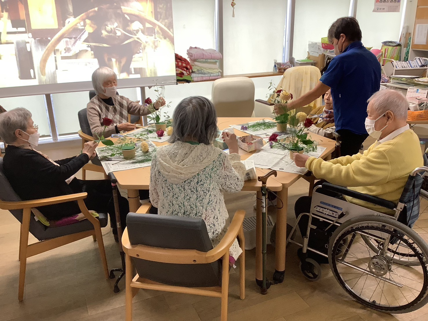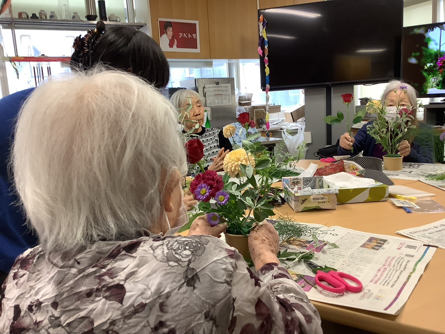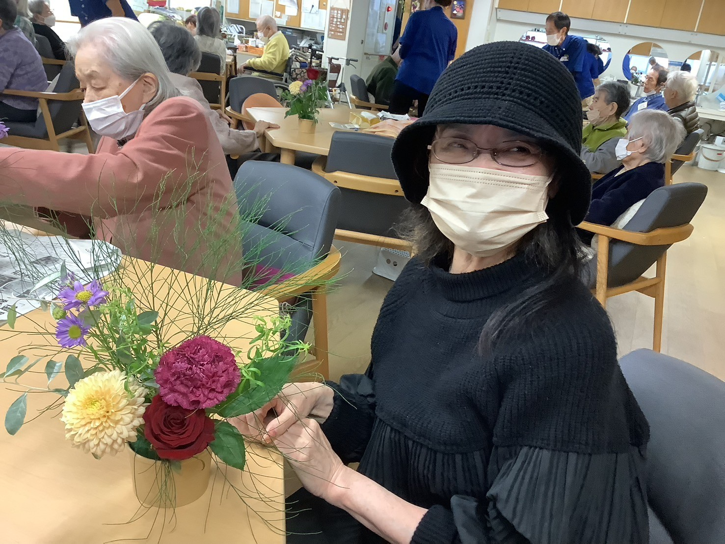 ですので、今日の午後のプログラムはそんな鬱々とした気分を吹っ飛ばすためフラワーアレンジメントを開催しました🌼