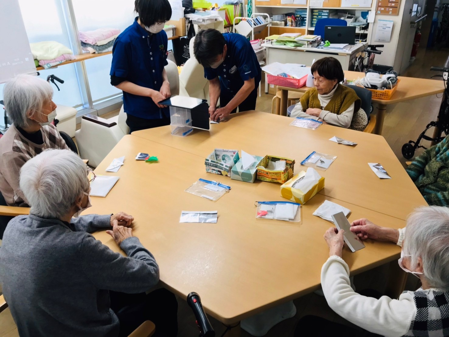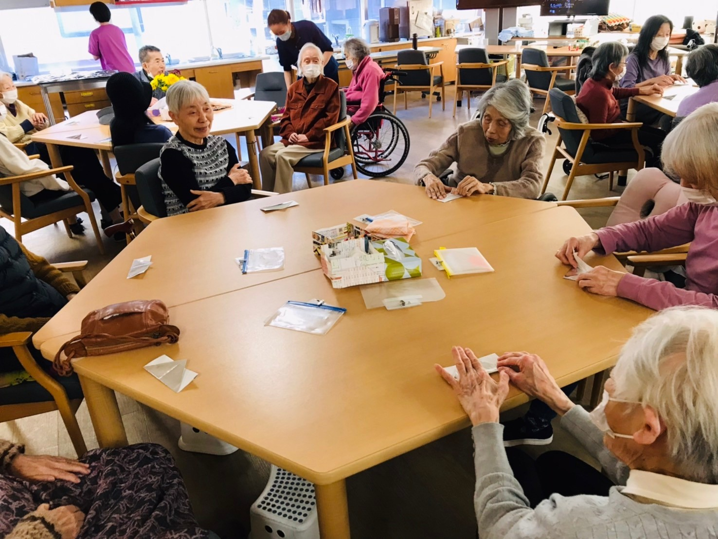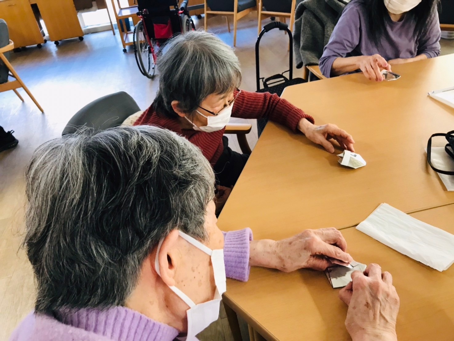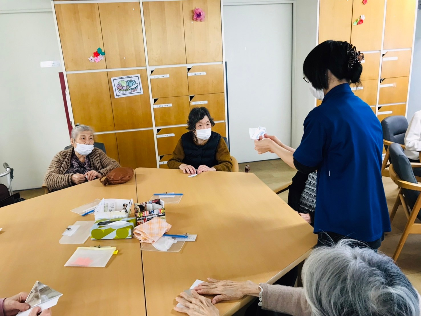 今日の担当職員から他の職員も折り方を教わって、キレイでかわいいベルを折っていきます