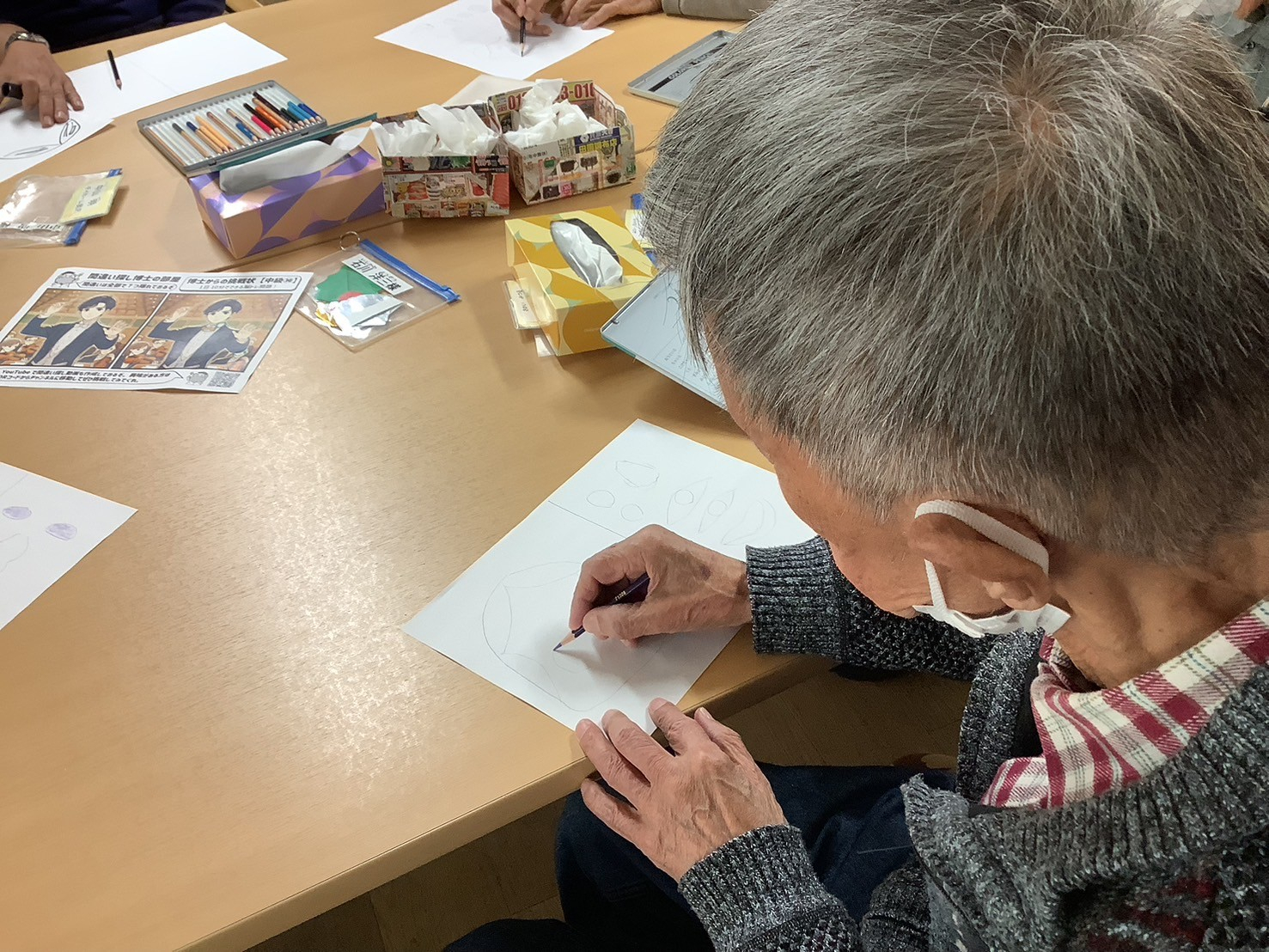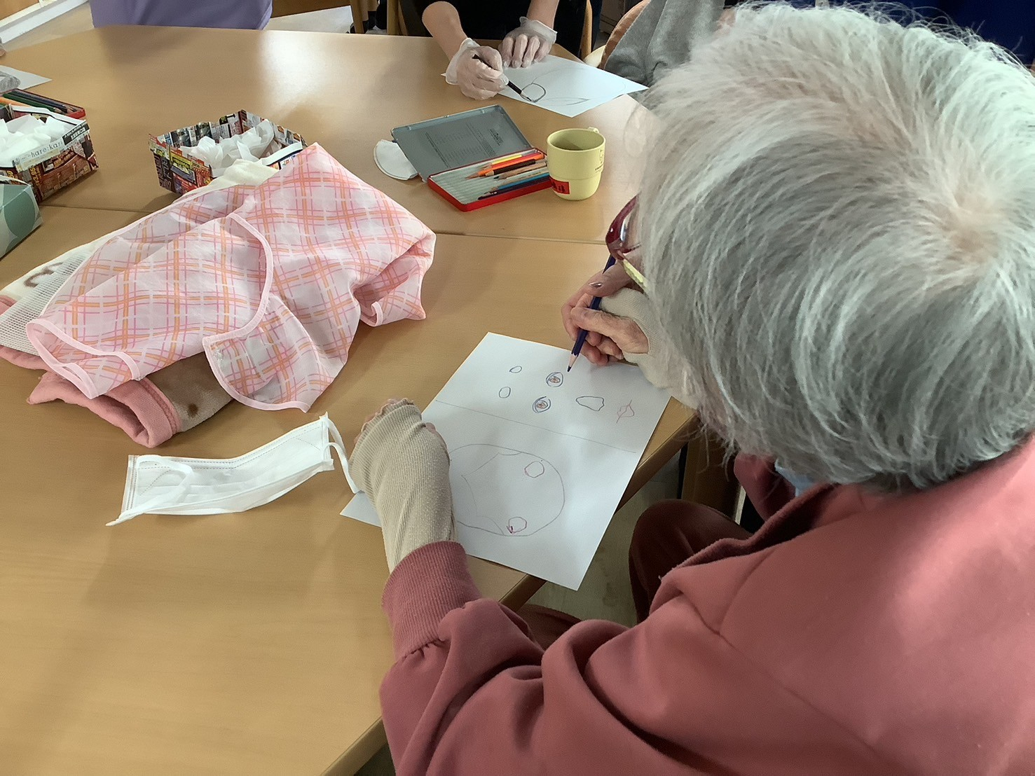 プロジェクターに映し出された画像を参考にしながら、それぞれの福笑いの輪郭と顔を別々に描いていきます✎