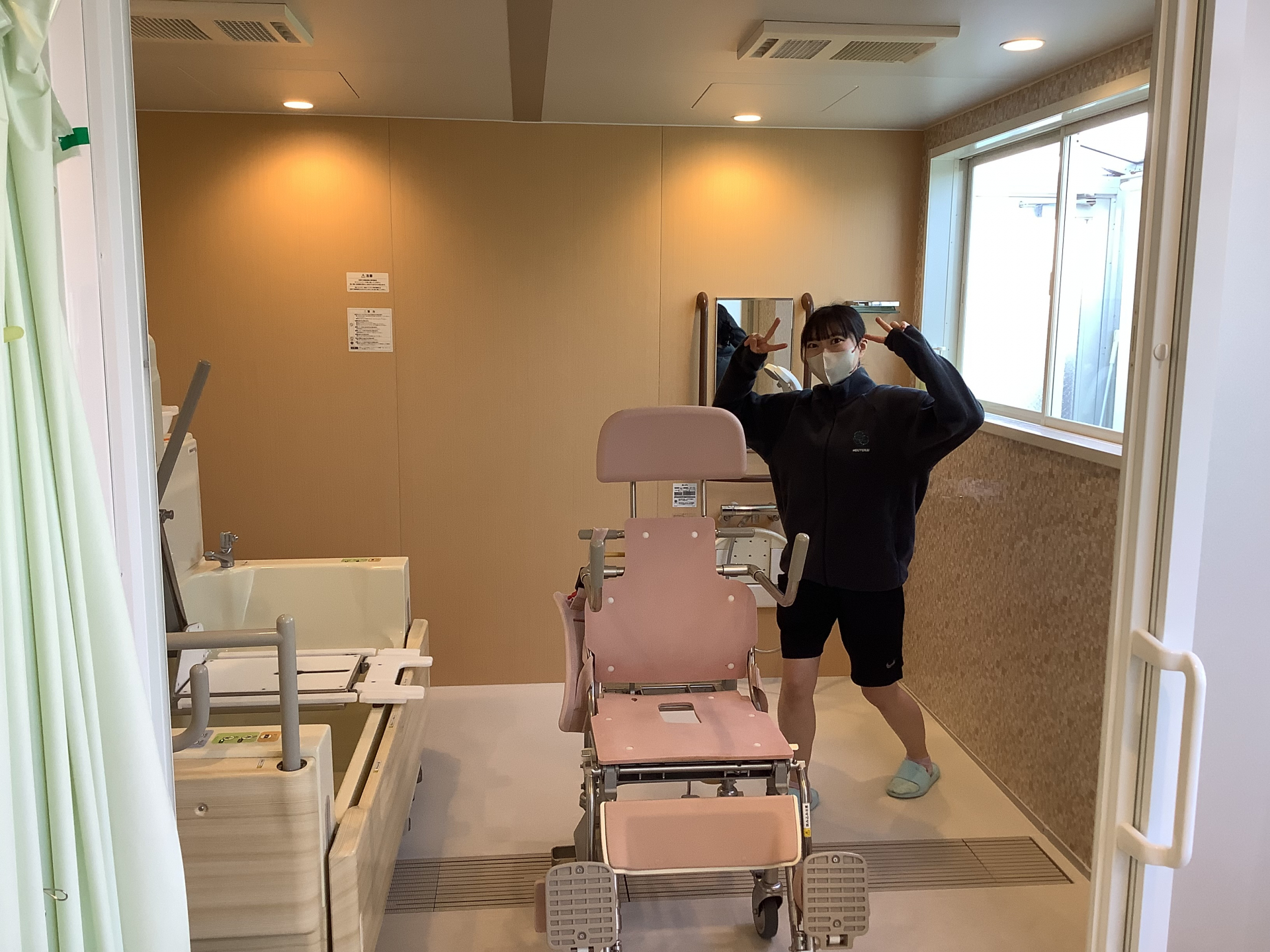 機械浴には大きな窓が付いている為、日も入りとても明るいですー!!室内にも暖房がありますので、今の時期はとても暖かく入浴することができます!!
