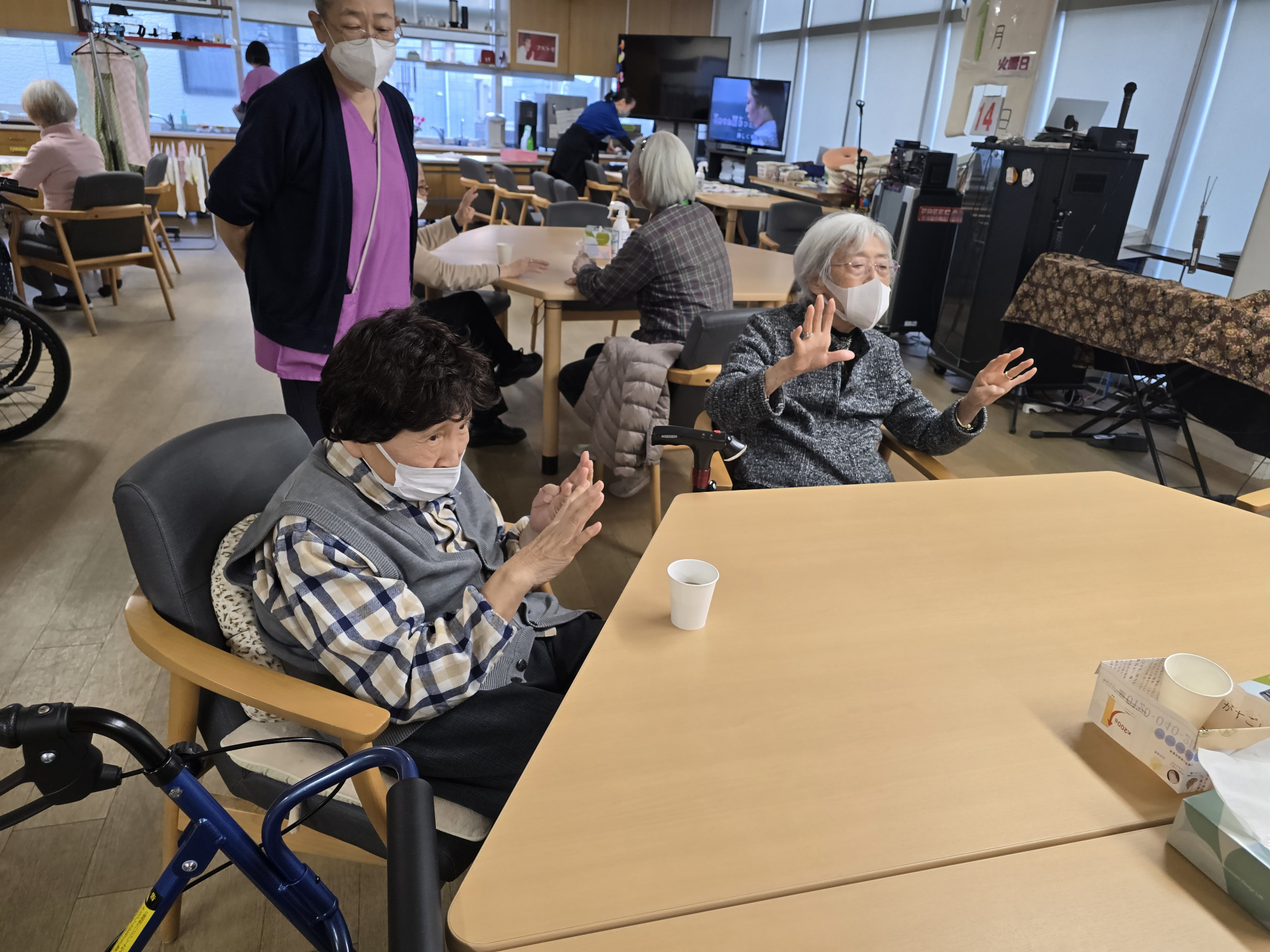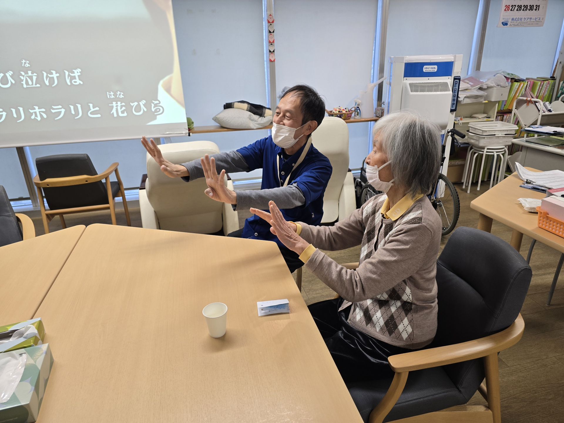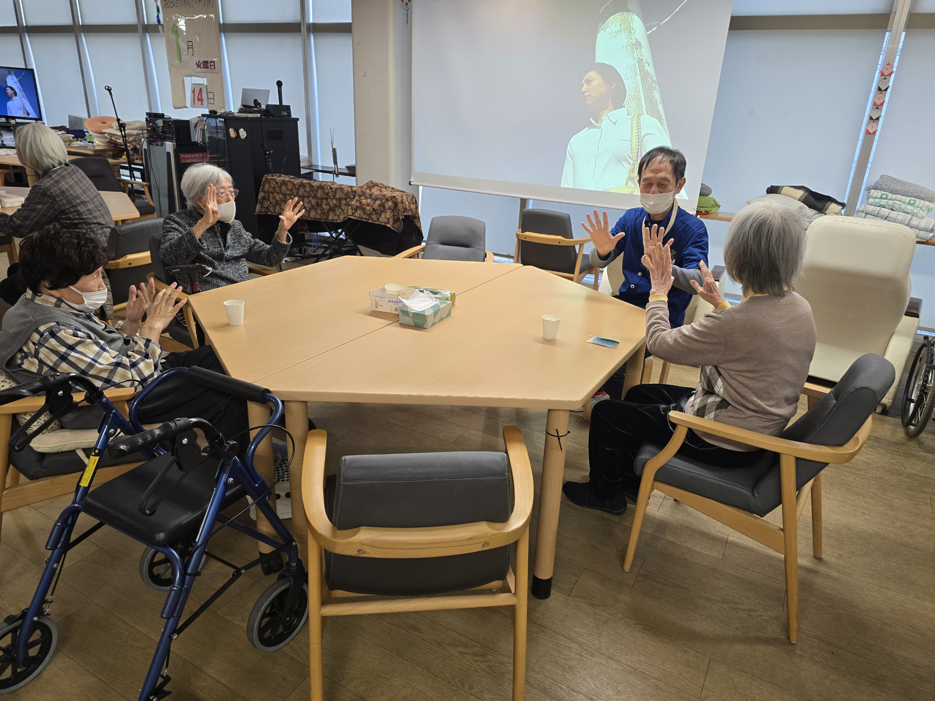 親指を順番に折ったり、グーパー体操をしたりと、職員と一緒に元気に参加されていましたー!!