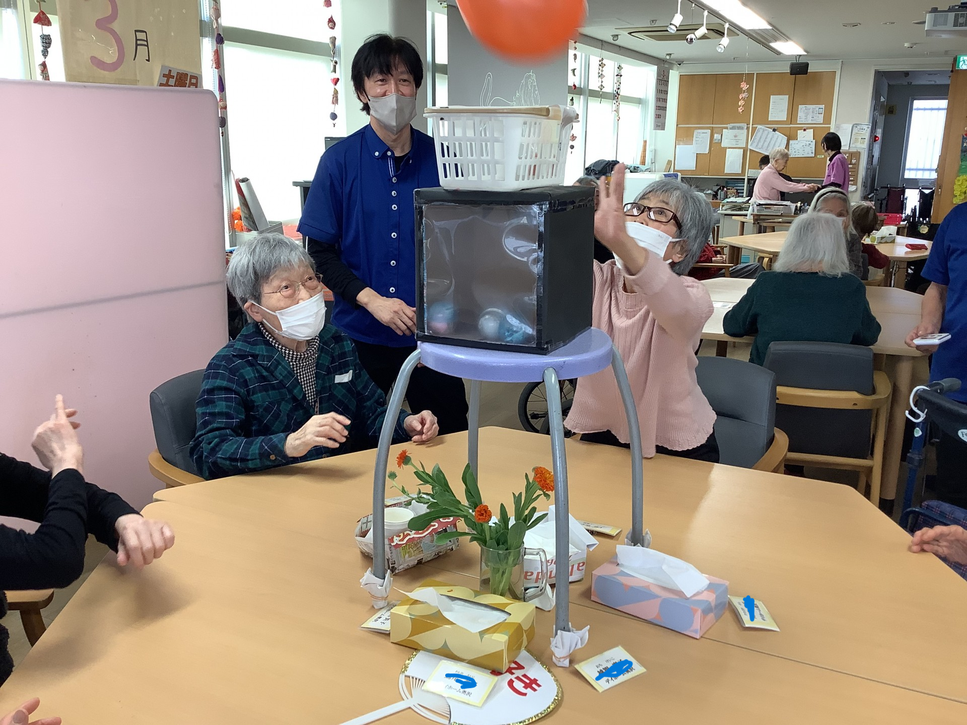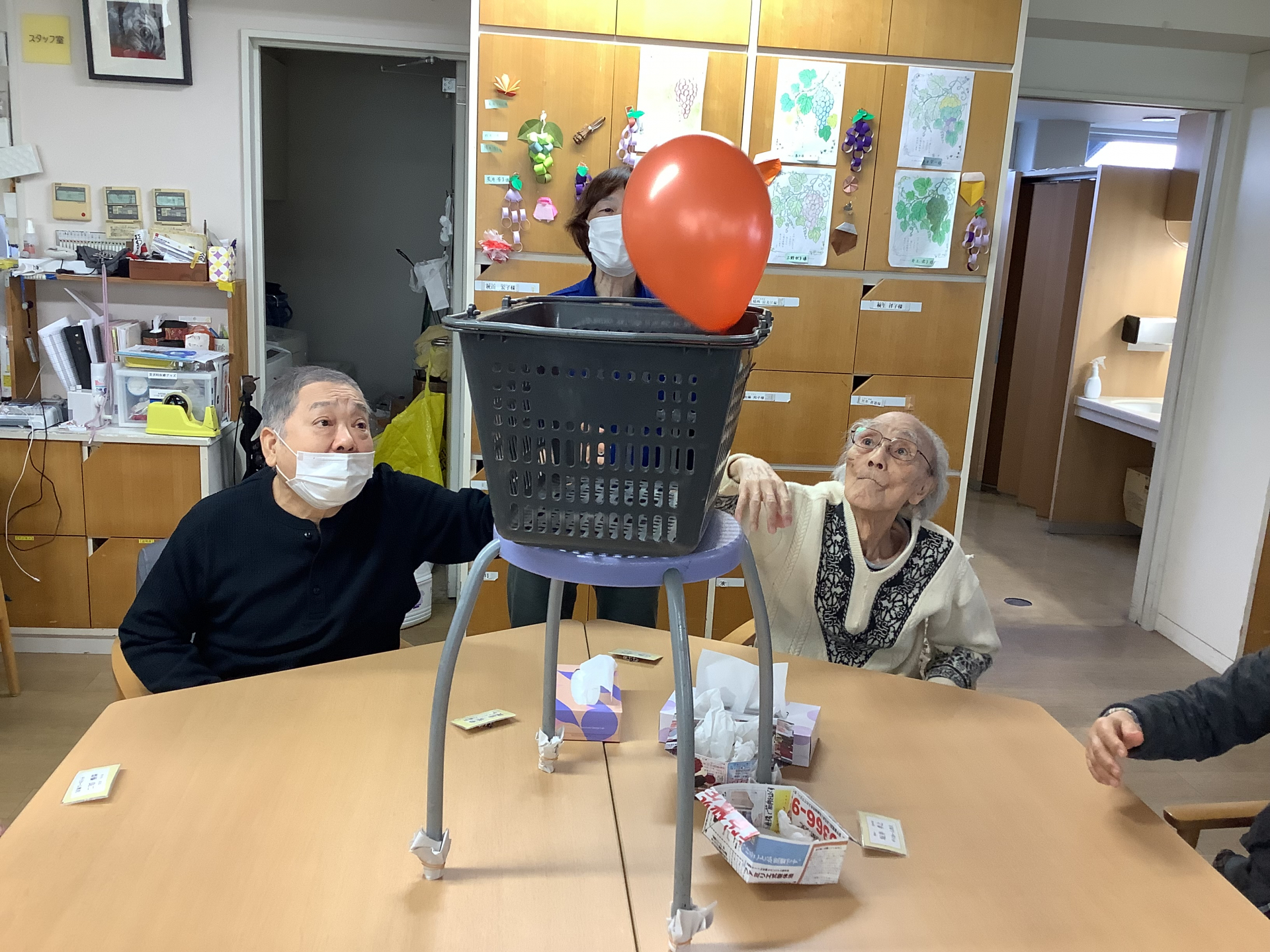 普通の風船バレーとは違い、真ん中のかごに入れたらポイントが入ります‼