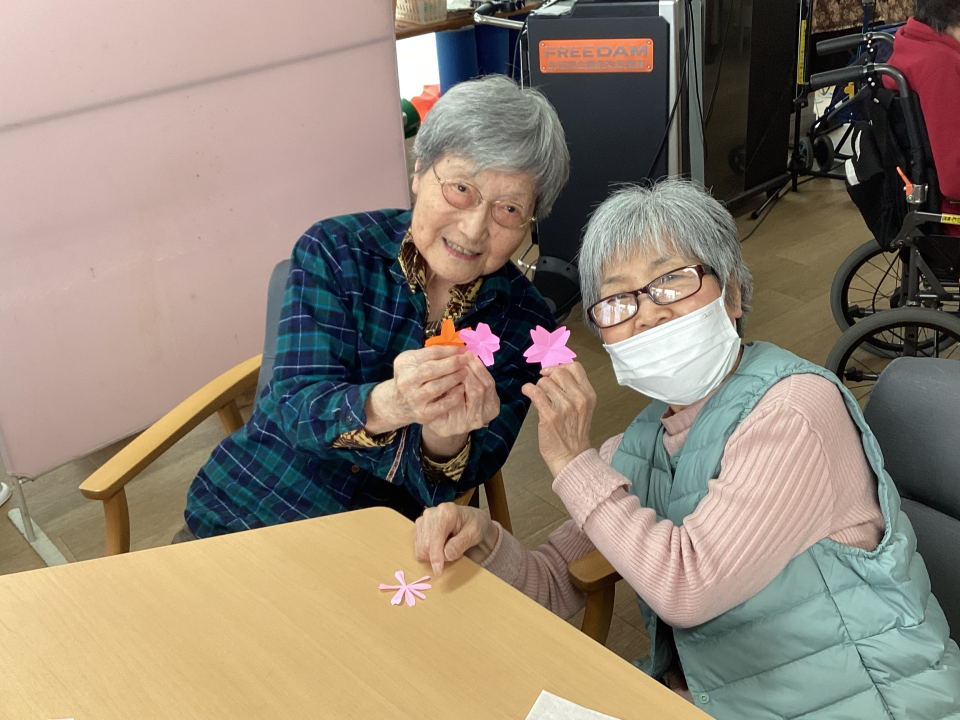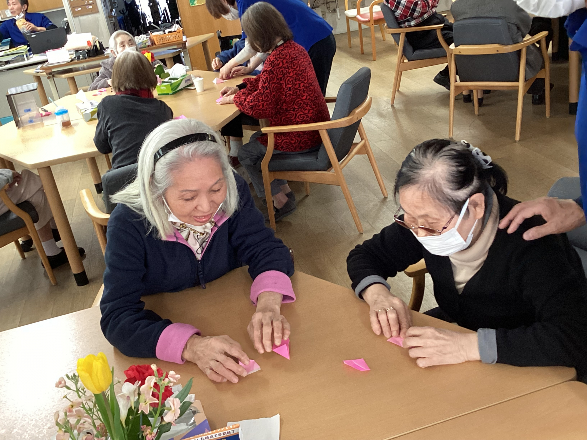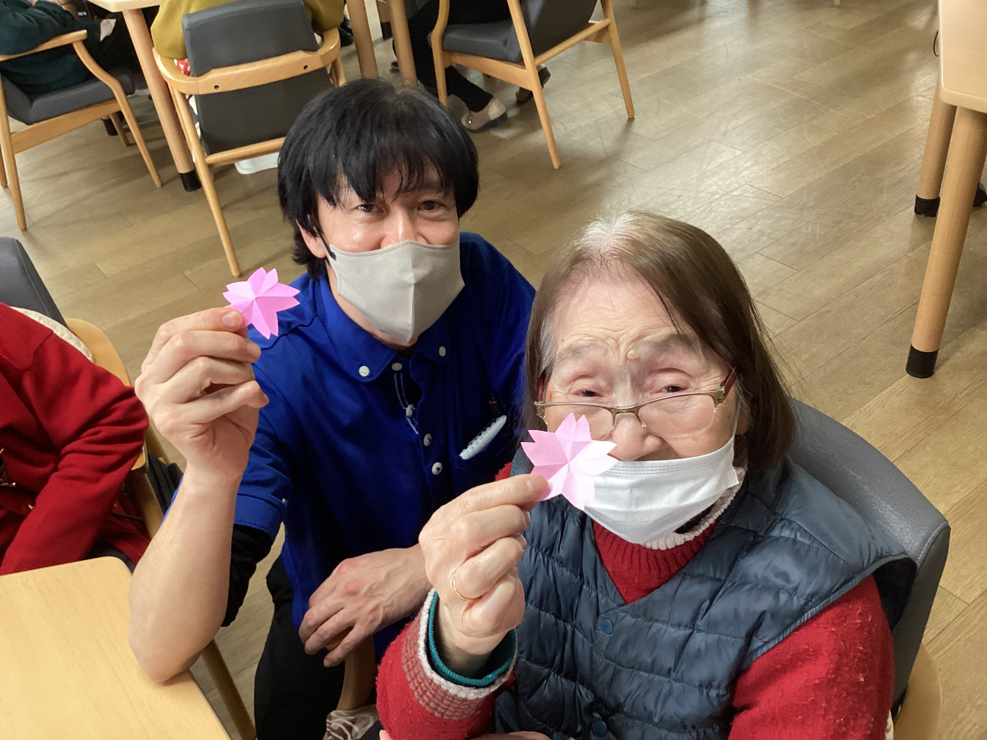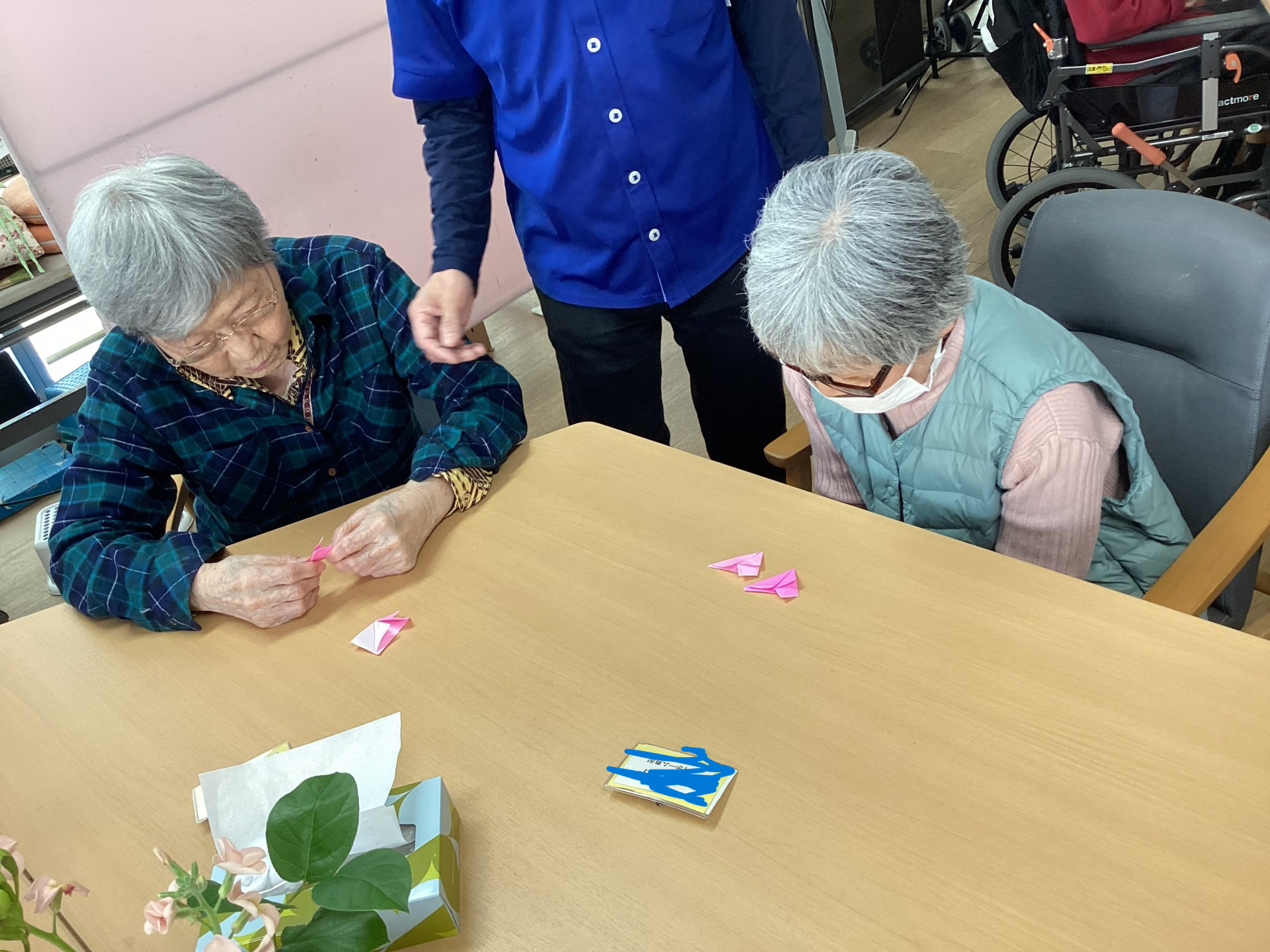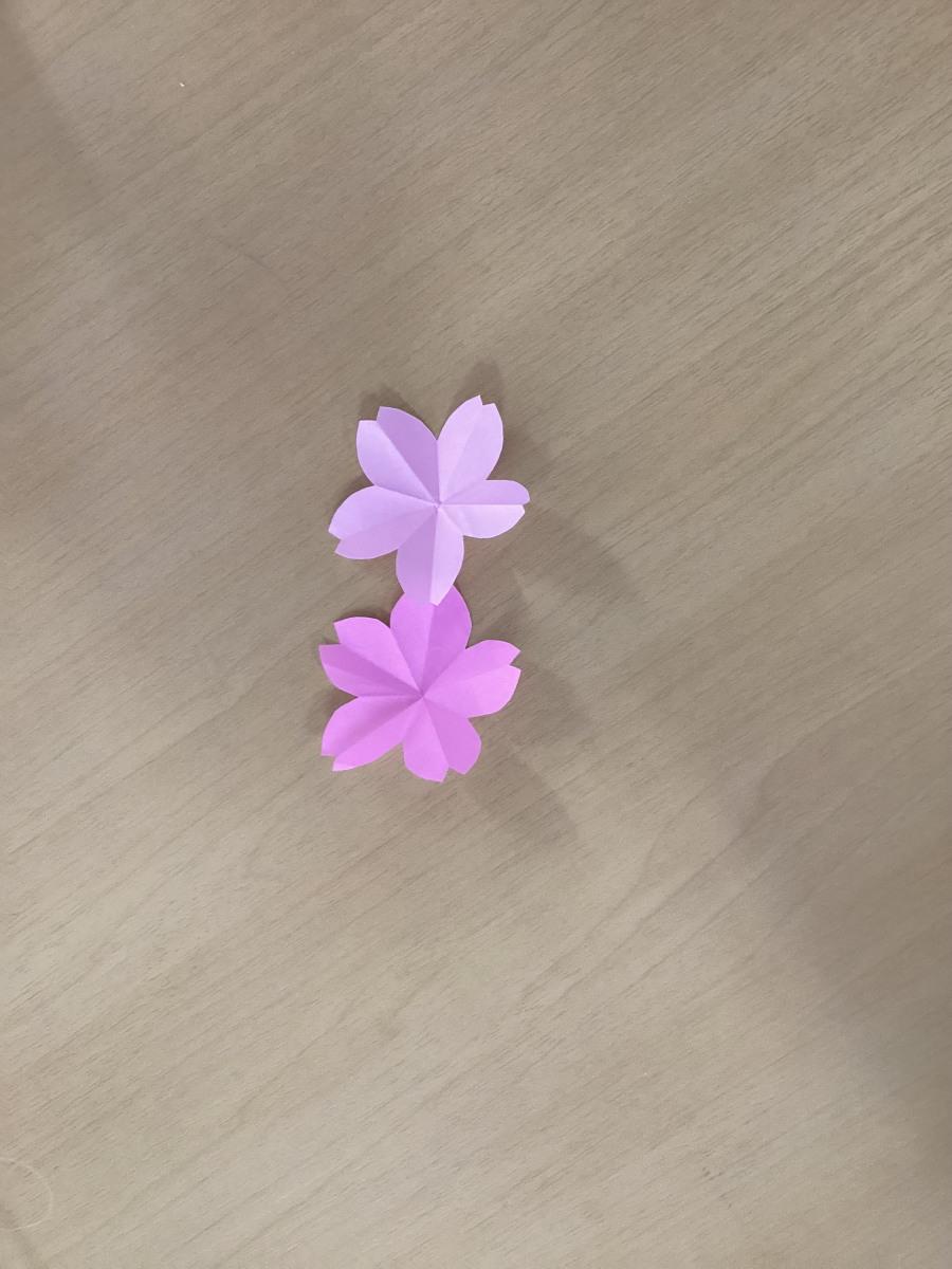 今日は桜の花びらを折り紙で作りましたー‼