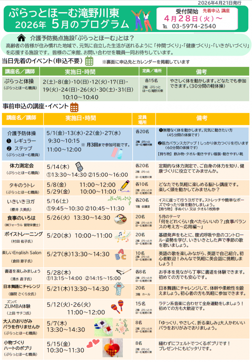 2026.04.21 お知らせ ぷらっとほーむ滝野川東 5月のプログラム Tweet シェアする ぷらっとほーむ滝野川東5月のプログラムを発行いたしました。 ぜひ、ご覧ください。 次の記事 2026.04.07 お知らせ ぷらっとほーむ滝野川リニューアルオープンしました 一覧へ戻る