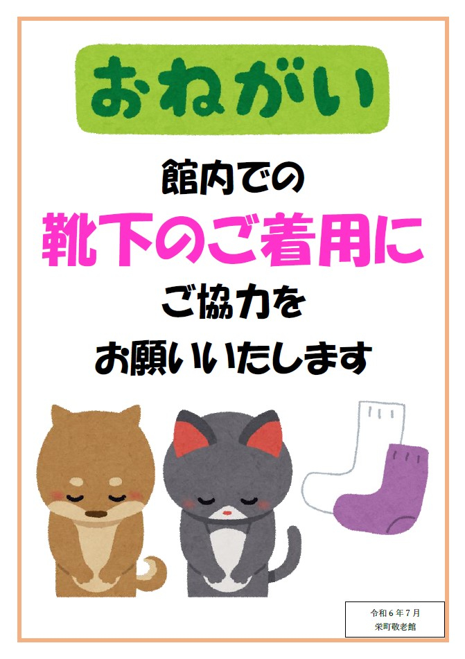 薄着になる季節になりますが、館内では水虫等の感染症を防ぐため靴下の着用をお願いしております。