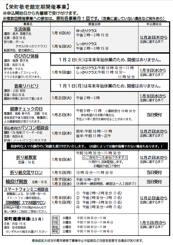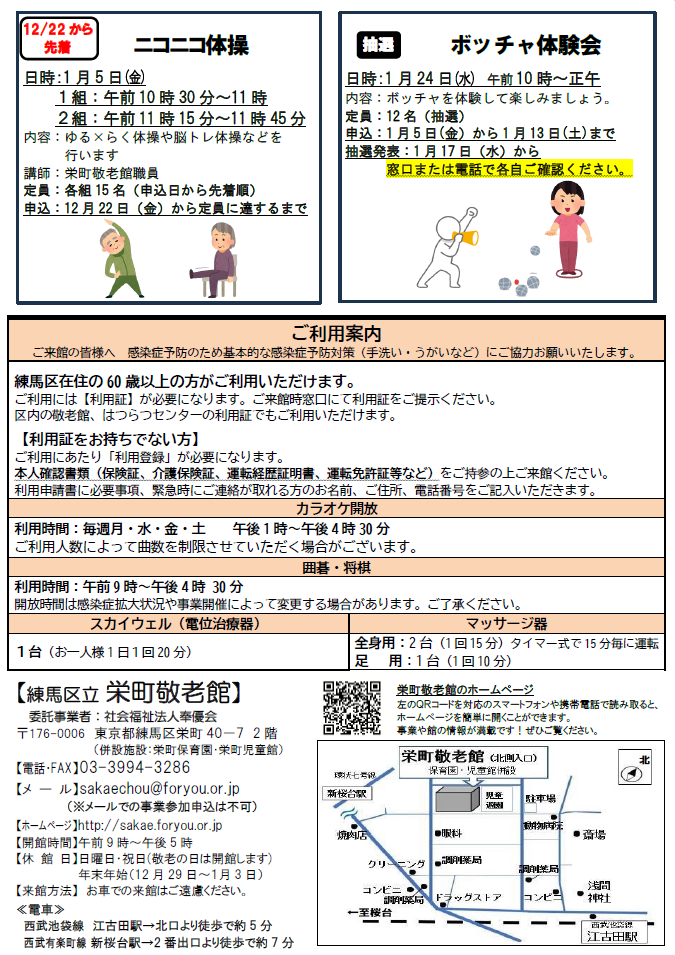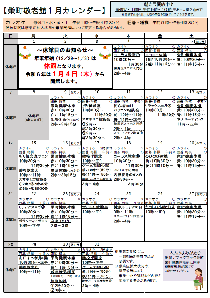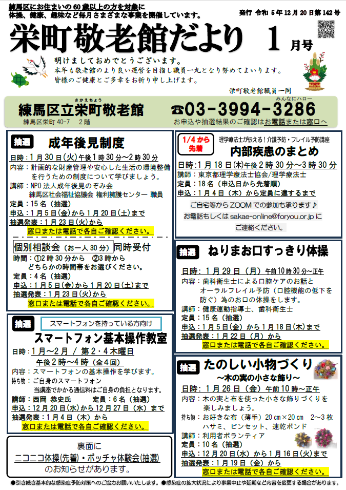 2023.12.20 お知らせ 栄町敬老館便り1月号を発行いたしました Tweet シェアする 栄町敬老館だより1月号を発行いたしました。 事業に関するお申込みやお問合せは、栄町敬老館までお願いいたします。栄町敬老館03-3994-3286 前の記事 2023.12.25 お知らせ 年末の風物詩!『年末寄席』を開催いたしました! 次の記事 2023.12.19 お知らせ 今年最後の『詩吟教室』 一覧へ戻る