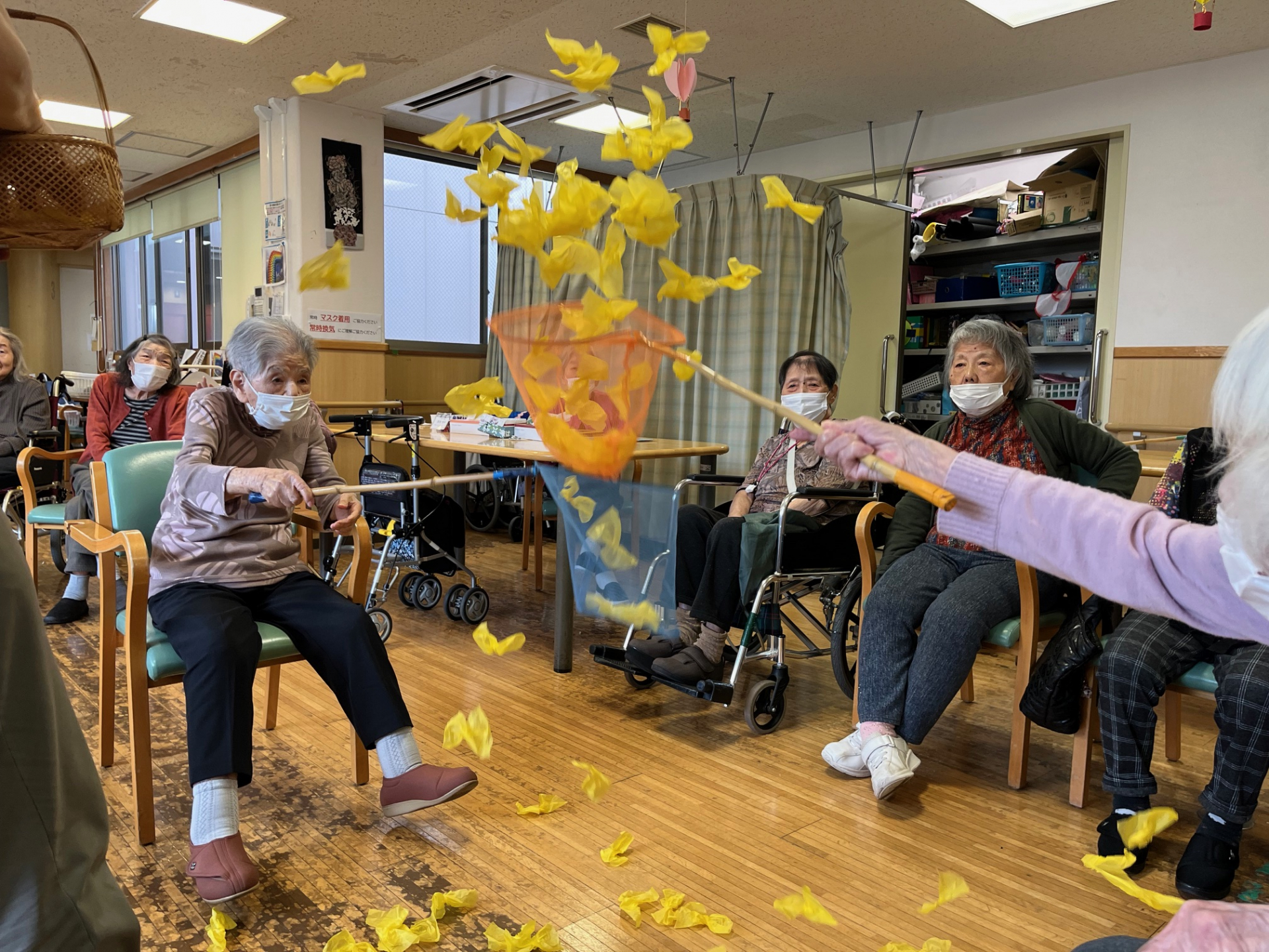 黄色の薄葉紙を蝶々に見立てて上から降ってくる蝶々をキャッチするという簡単なゲームです