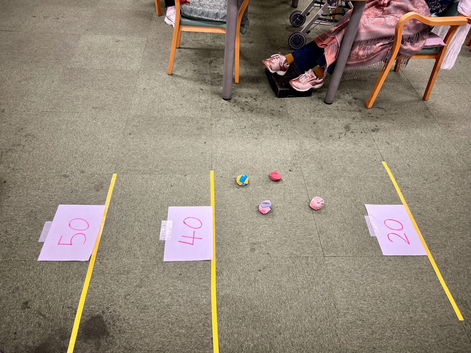 ルールは足の甲に上手くお手玉を乗せ、ゴールに目掛けて飛ばす「お手玉飛ばし!」というゲームです。