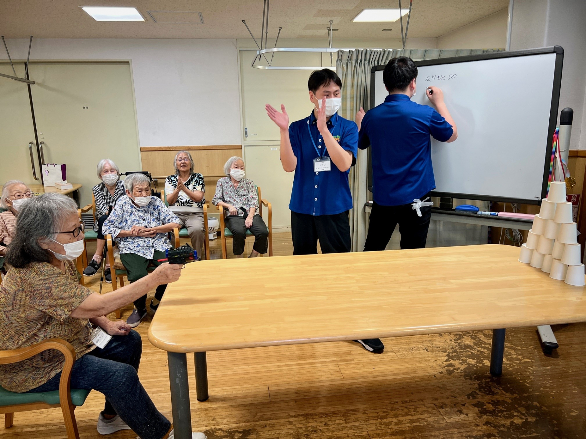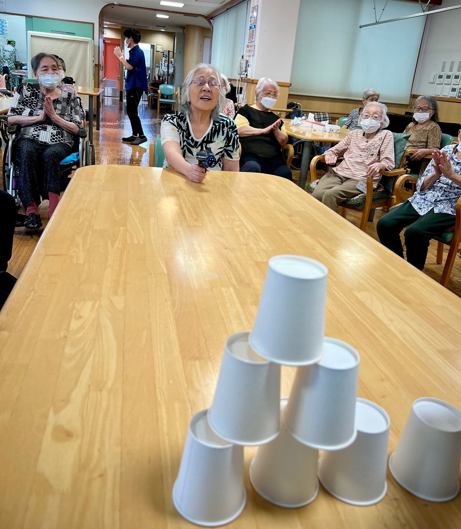 紙コップのタワーを作り、何個落とせるかを競いました。
